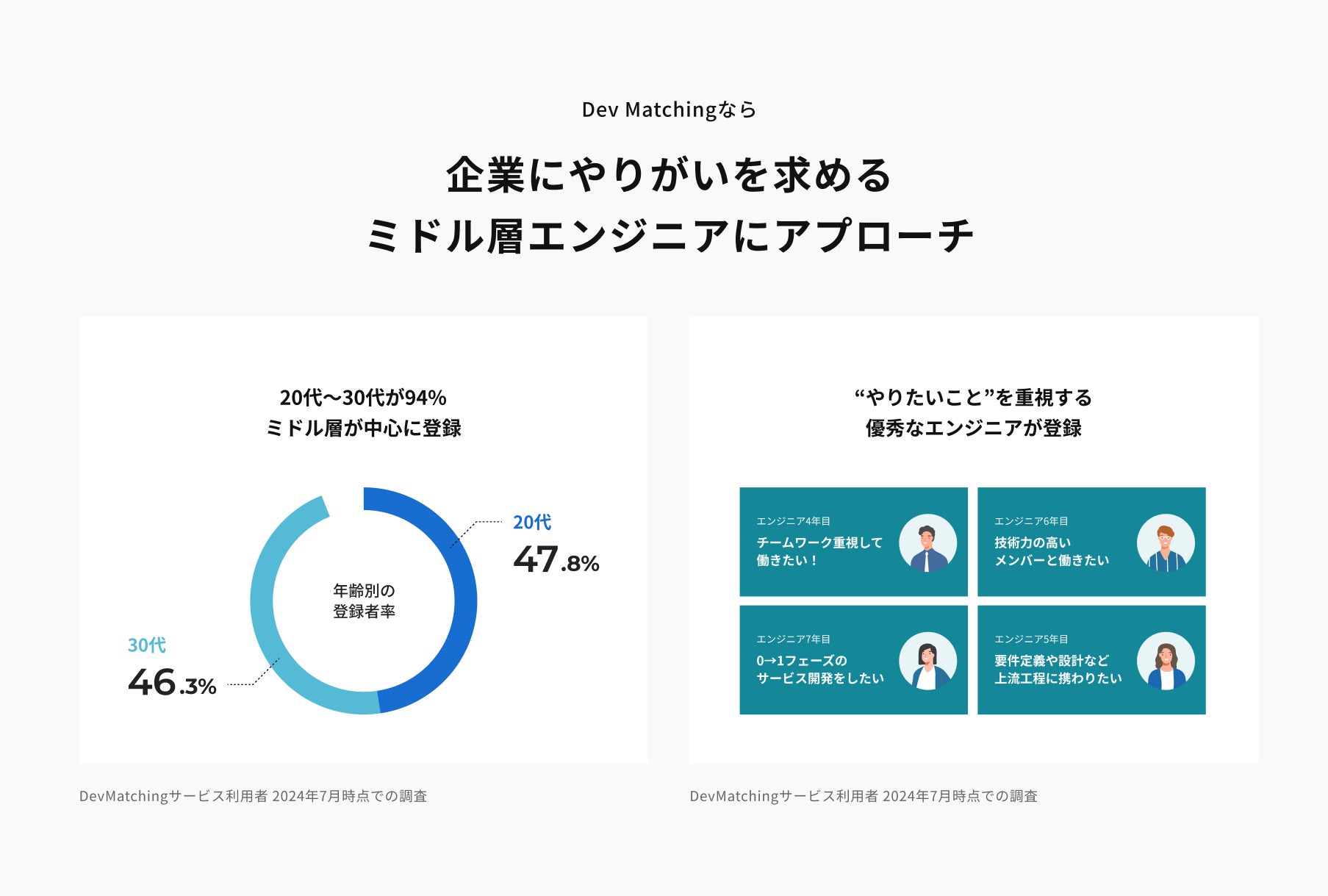 『Dev Matching(デブマッチング)』 は、ITエンジニアが重視するニーズでマッチングする採用サービスです。