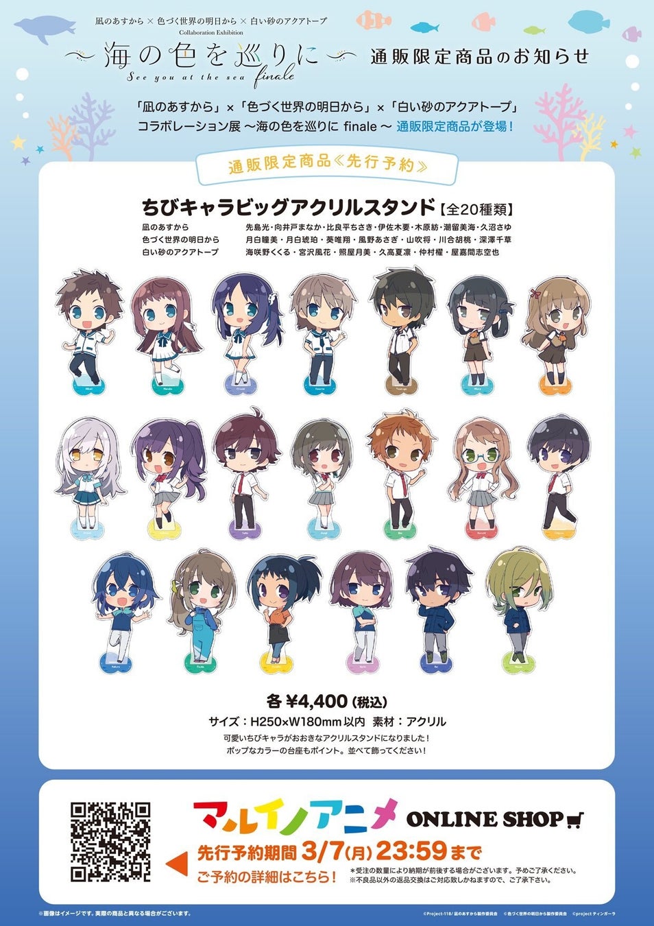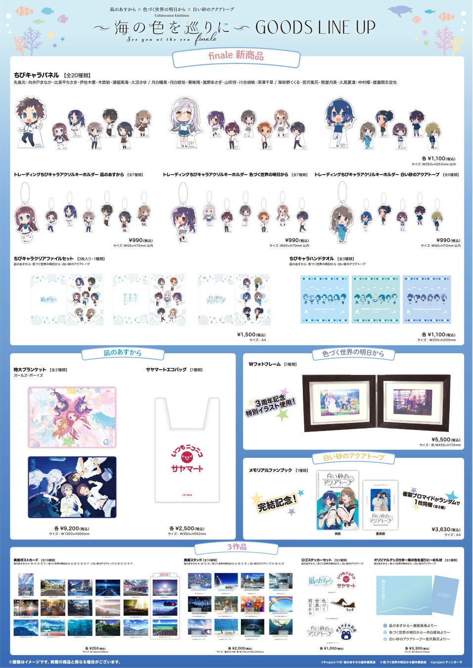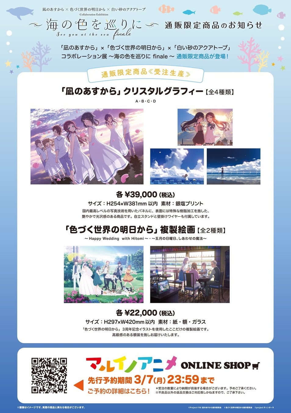 「凪のあすから」×「色づく世界の明日から」×「白い砂のアクアトープ」コラボレーション展「海の色を巡りに~finale~」の、描き下ろしイラストグッズなどの事後通販が開始となりました!