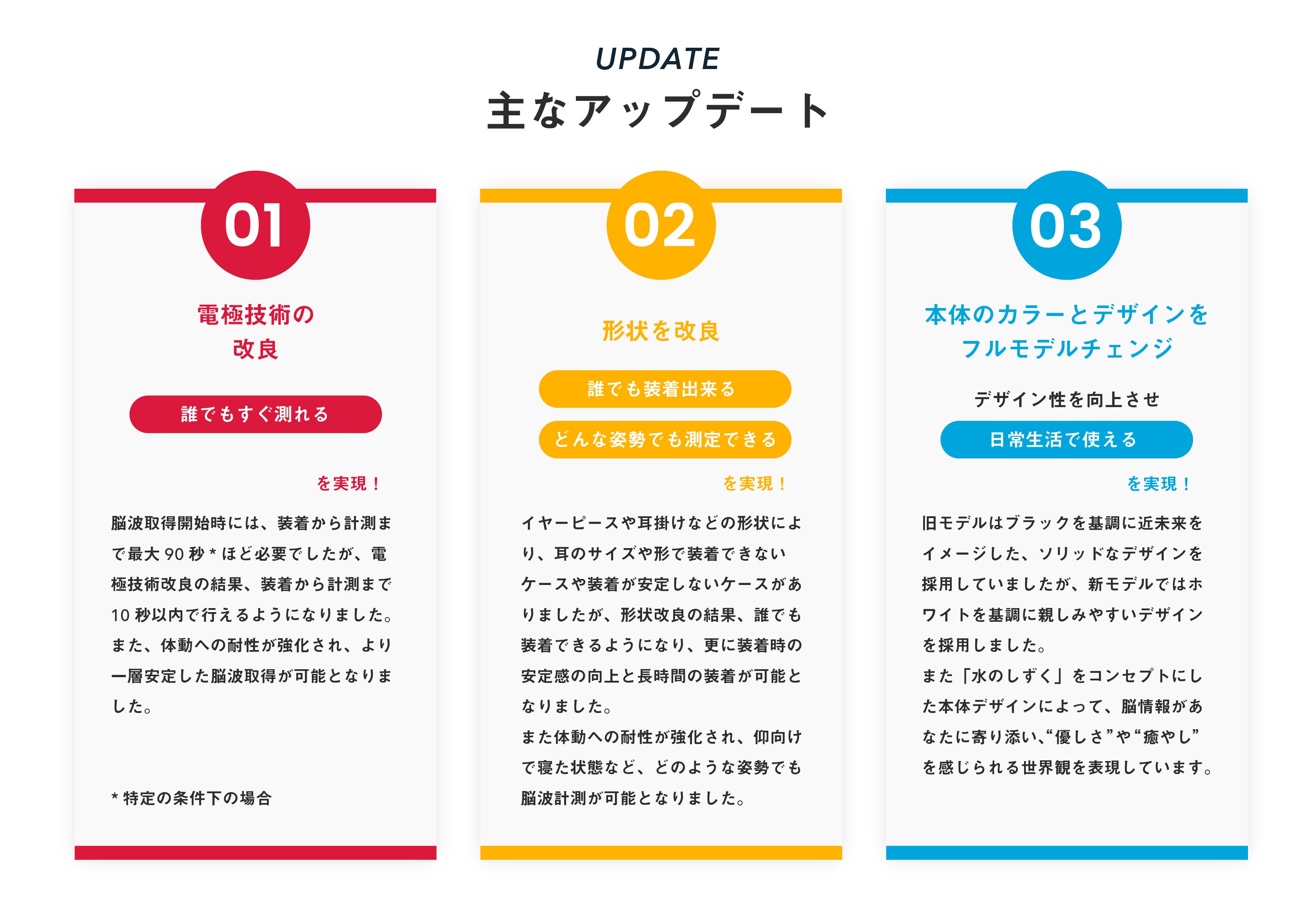 新たなモデルでは、脳波取得性能や装着性といったBCIデバイスとしての基本性能を向上させたほか、運転中や会話が必要となるシーンなどで便利な外音取り込み機能を備えた特別なモデルをラインナップに追加しました。