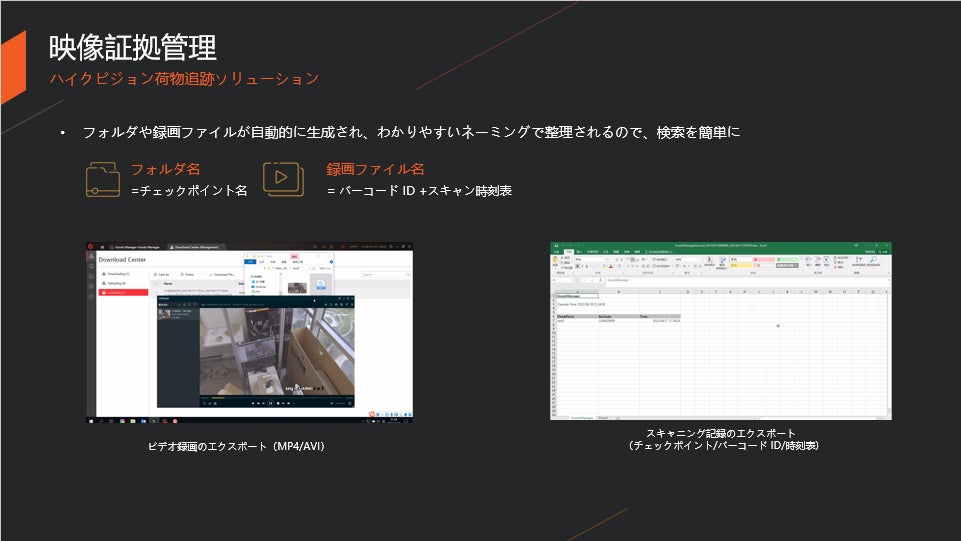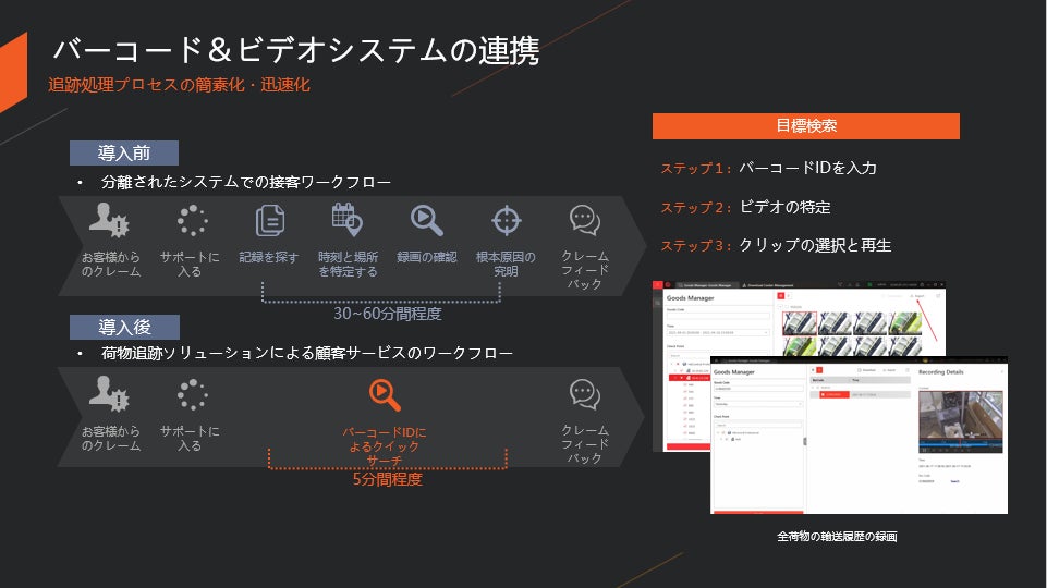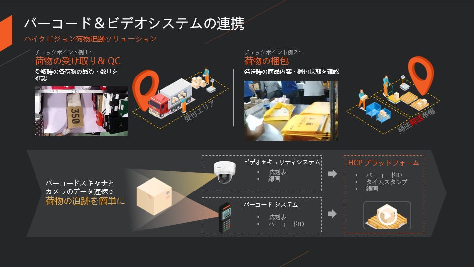 CCTV監視システムとバーコード読み取りシステムのデータは、時間、場所、バーコード、ビデオがHCPプラットフォームでマッチングされ、記録される。このようなデータにより、事故発生時の分析や調査が簡単かつ便利になる。