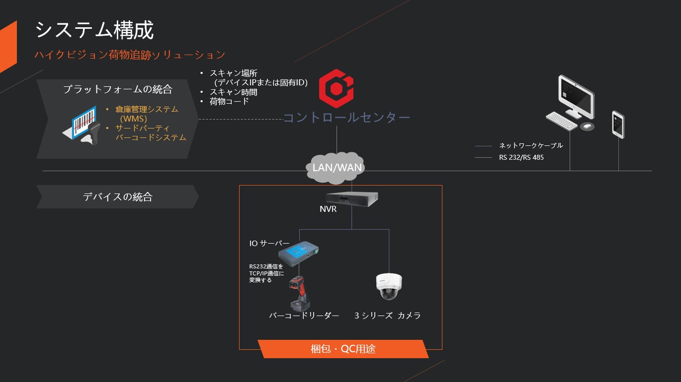 システム構成はカメラ+バーコードリーダー+NVR+管理ソフトHCPプラットフォームとなる。