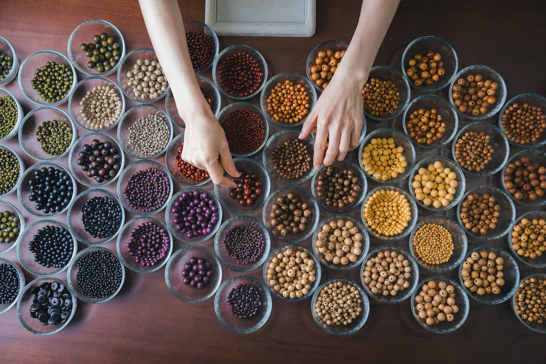 国内外の銘木から作られた様々な色やサイズの木珠をゴムに通し、ブレスレットを作ります。