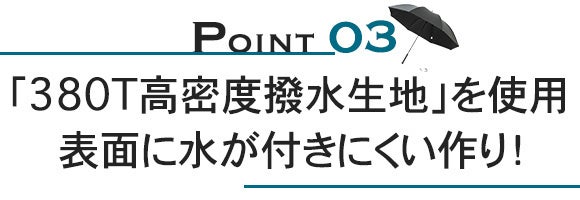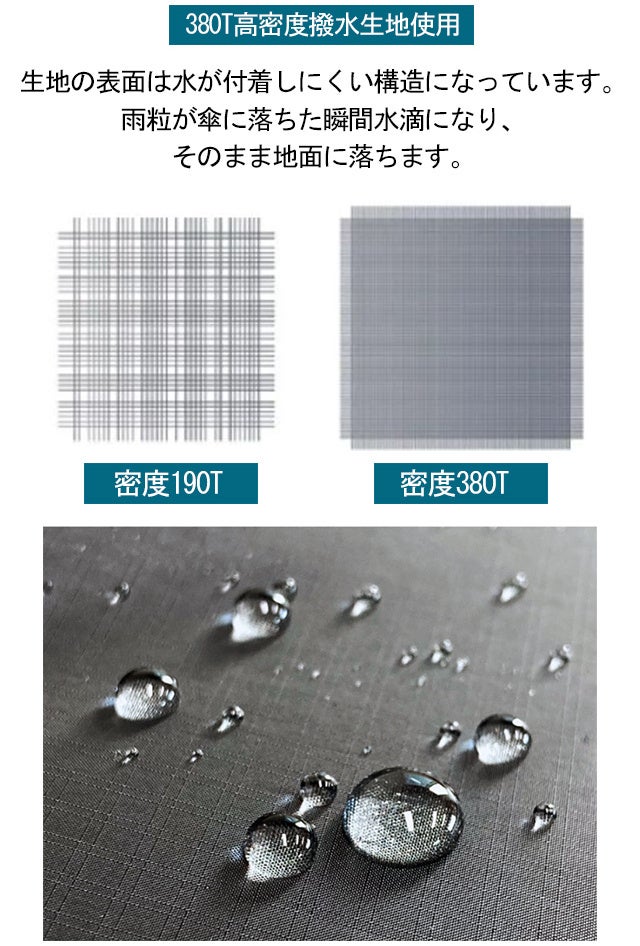 - 「380T高密度撥水」の生地を使用、雨粒が傘に付着しづらく、差した後瞬時に収納可能です!