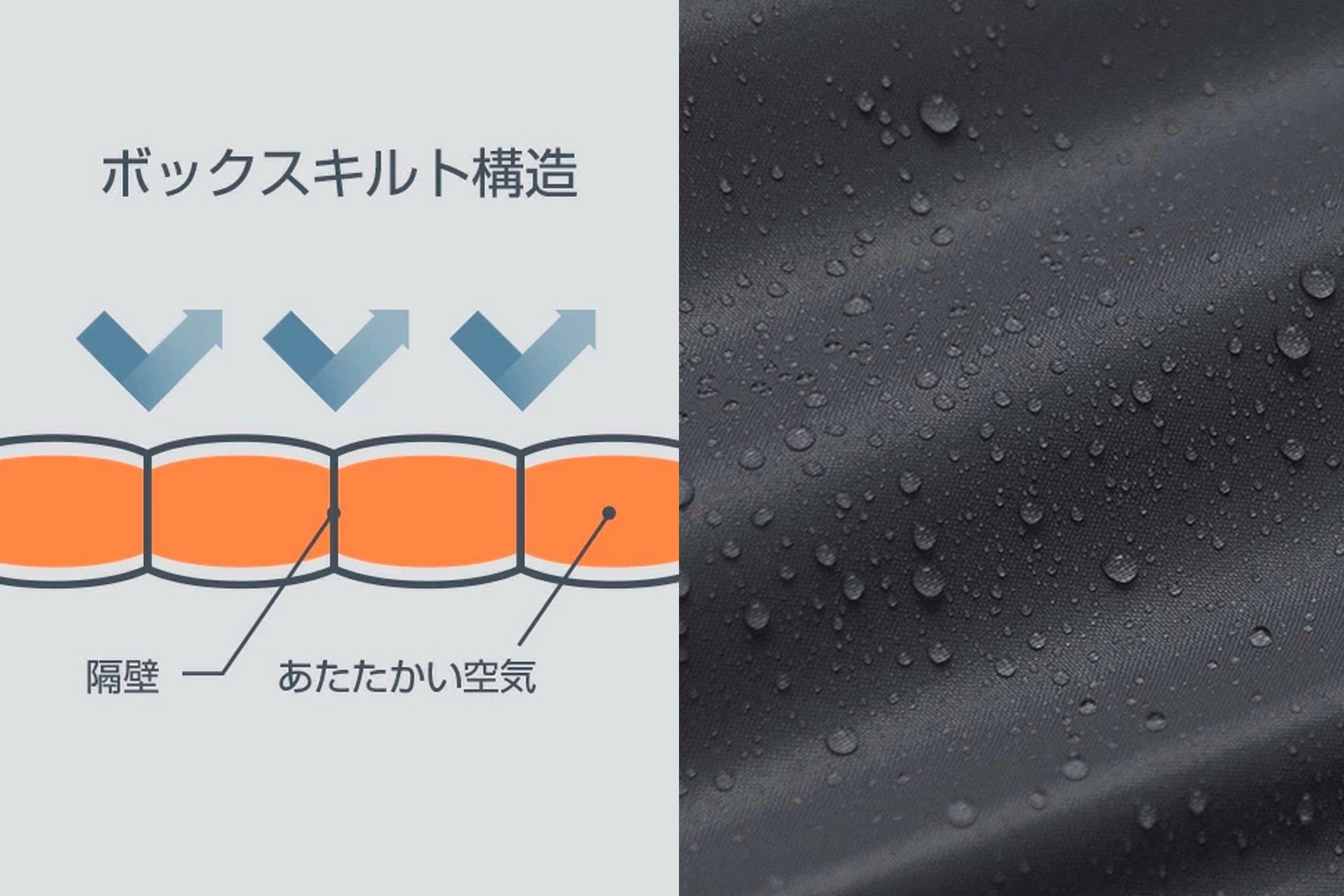 また、20D(デニール)の撥水ナイロンを使用したストレッチ縫製とボックスキルト構造を採用することで、伸縮による快適性と保温性能を高レベルで実現しました。