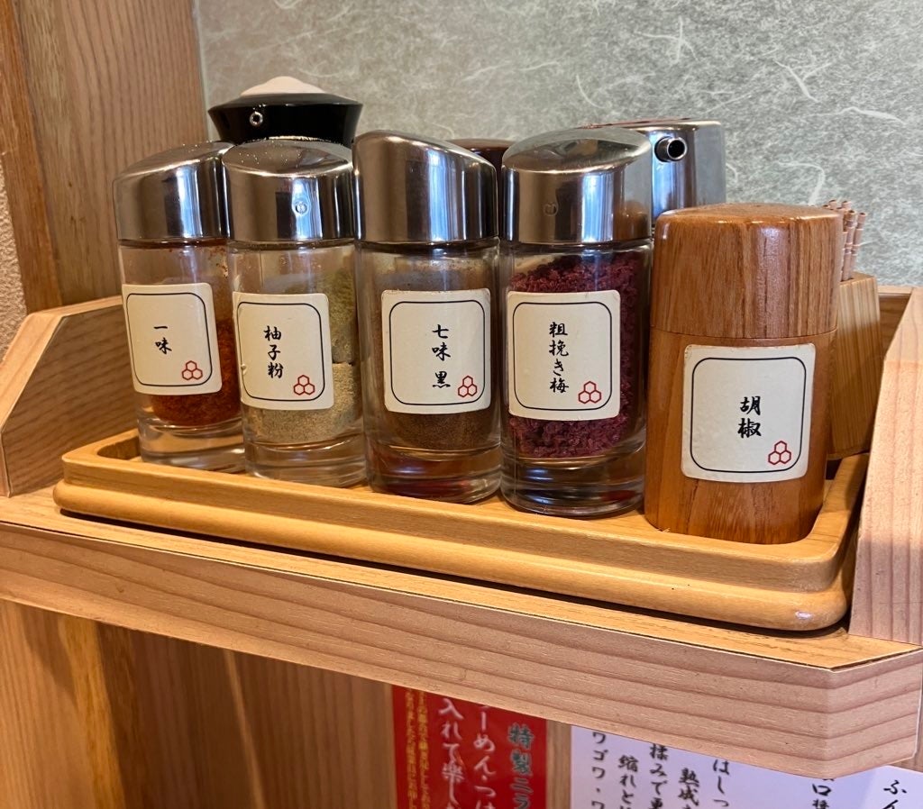 毎日食べても飽きない工夫として、卓上調味料も充実しています。黒胡椒、粗挽き梅、七味黒、柚子粉、一味など、舎鈴のつけめんとらーめんに合うものを厳選。特製のニラ辛味もご用意しており、辛いもの好きのお客様にも満足いただけます。