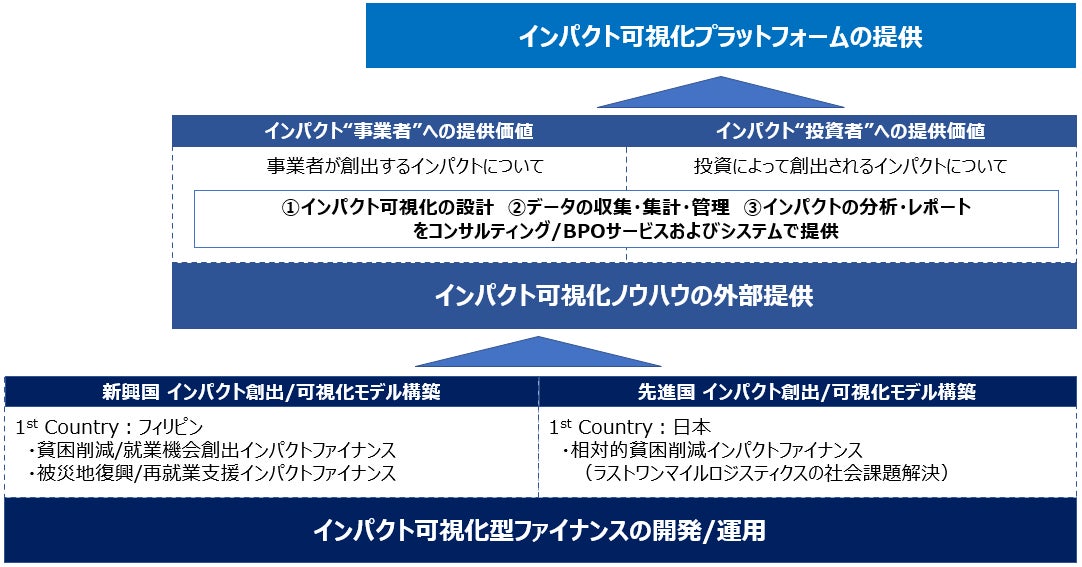 この度、インパクト可視化のコンサルティング/BPOを正式なサービスとして様々な事業者や投資者等の資金供給者へ提供すると共に、調達資金を活用し、事業活動におけるインパクト可視化やインパクト投資におけるIMM(Impact Measurement and Management)プロセスのDXを実現するインパクト可視化システムを提供してまいります。