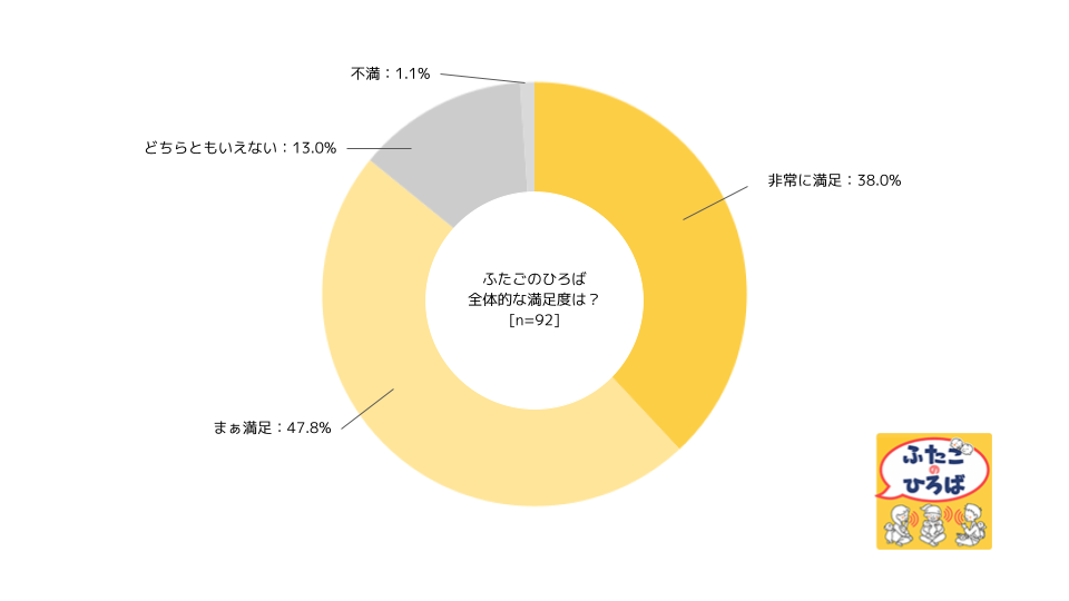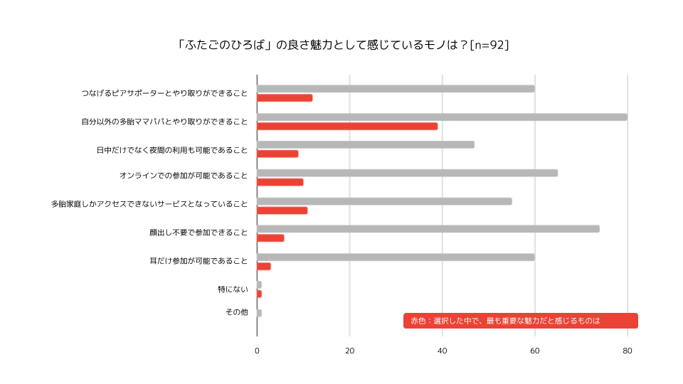 『ふたごのひろば』の全体的な満足度としては「非常に/まあ満足」を選択した人が85.9%であった。また、『ふたごのひろば』の良さ・魅力については、「自分以外の多胎ママパパとやり取りができること」を選択した利用者が多いという回答結果であった。これらのことから、音声で交流できる『ふたごのひろば』で、自身と同じ多胎ママパパと時間や場所を気にせずコミュニケーション取れることが有用であることがうかがえる。(『ふたごのひろば』サービス詳細はこちらから → https://prtimes.jp/main/html/rd/p/000000004.000087597.html)