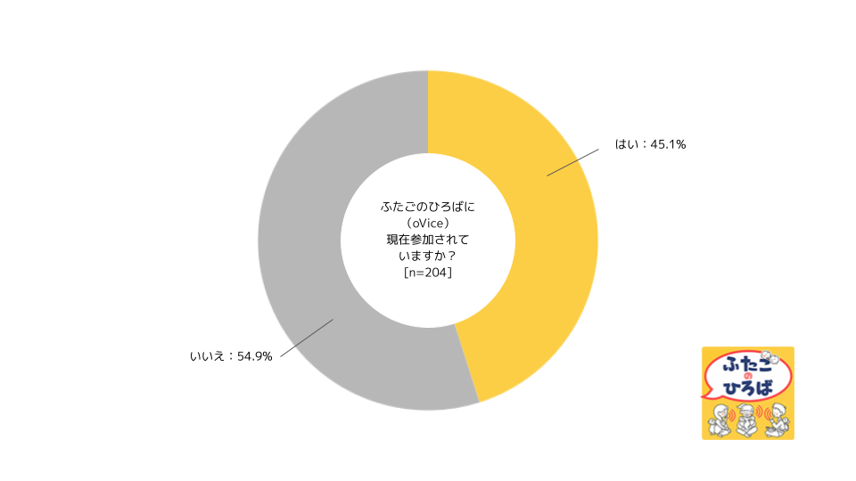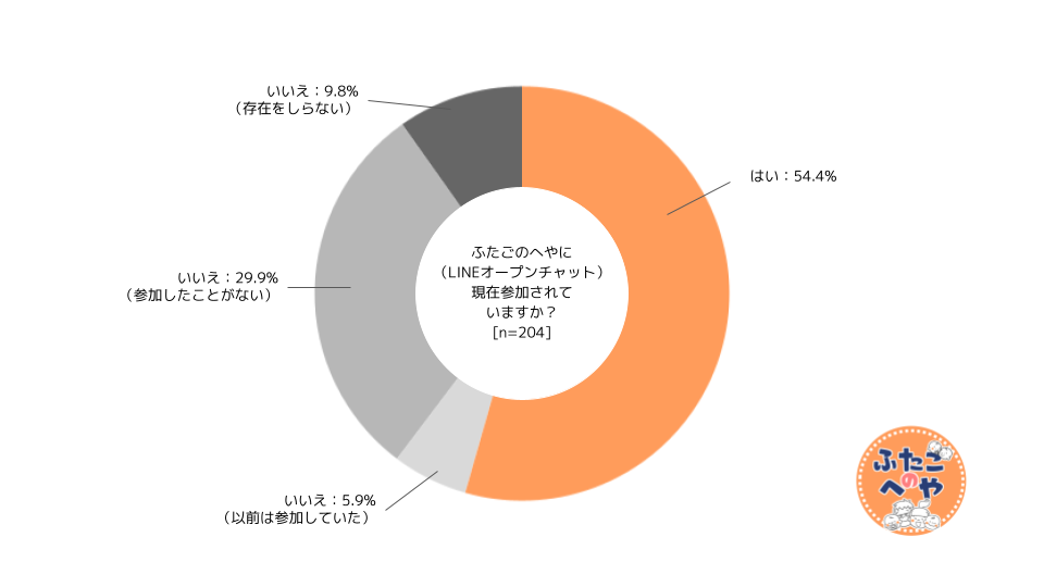 当法人が実施する『ふたごのへや(LINEオープンチャット)』と『ふたごのひろば(oVice)』2つのサービスへの利用状況としては、「ふたごのへや:54.4%」「ふたごのひろば:45.1%」となり、約半数の方がオンラインコミュニティに参加し、多胎育児にかかわるテーマで全国各地の多胎ママパパとコミュニケーションを取っていることがうかがえる。
