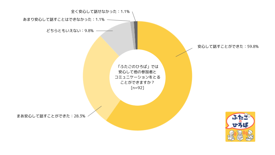 - 『ふたごのひろば』に満足している方は85.9%となっており、顔が見えない相手と音声だけのコミュニケーション空間に好意的であることがうかがえる。さらに「安心してコミュニケーションがとれた」と回答した方も88.0%となり、オンライン上での会話のやりとりもスムーズにできていると考えられる。