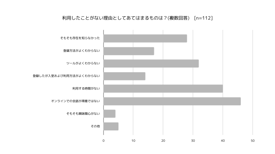 本調査回答者の約半数が『ふたごのひろば』を利用していないという中で、利用していない理由についても回答を求めたところ、「オンラインでの会話が得意ではない:46人」「利用する時間がない:40人」という結果となり、オンラインサービス利用への抵抗感があったり、育児負担の大きさから自分自身に費やす時間がないという実態がうかがえる。「そもそも興味がない:4人」ということからは、『ふたごのひろば』のようなオンラインサービスニーズは低くないという結果も得られた。