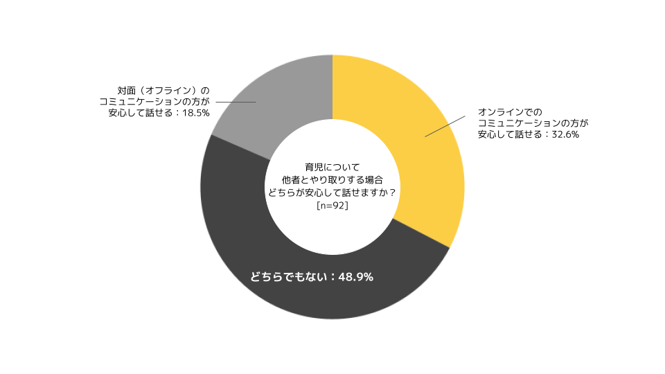 - オンライン・対面どちらのほうが安心して話せるかについては、いずれについても一長一短があることから「どちらでもない」と回答する方が大半であった。そのことから、多胎家庭の交流する場所としては、オンラインだけではなく対面での交流機会をつくることも重要と考えられる。
