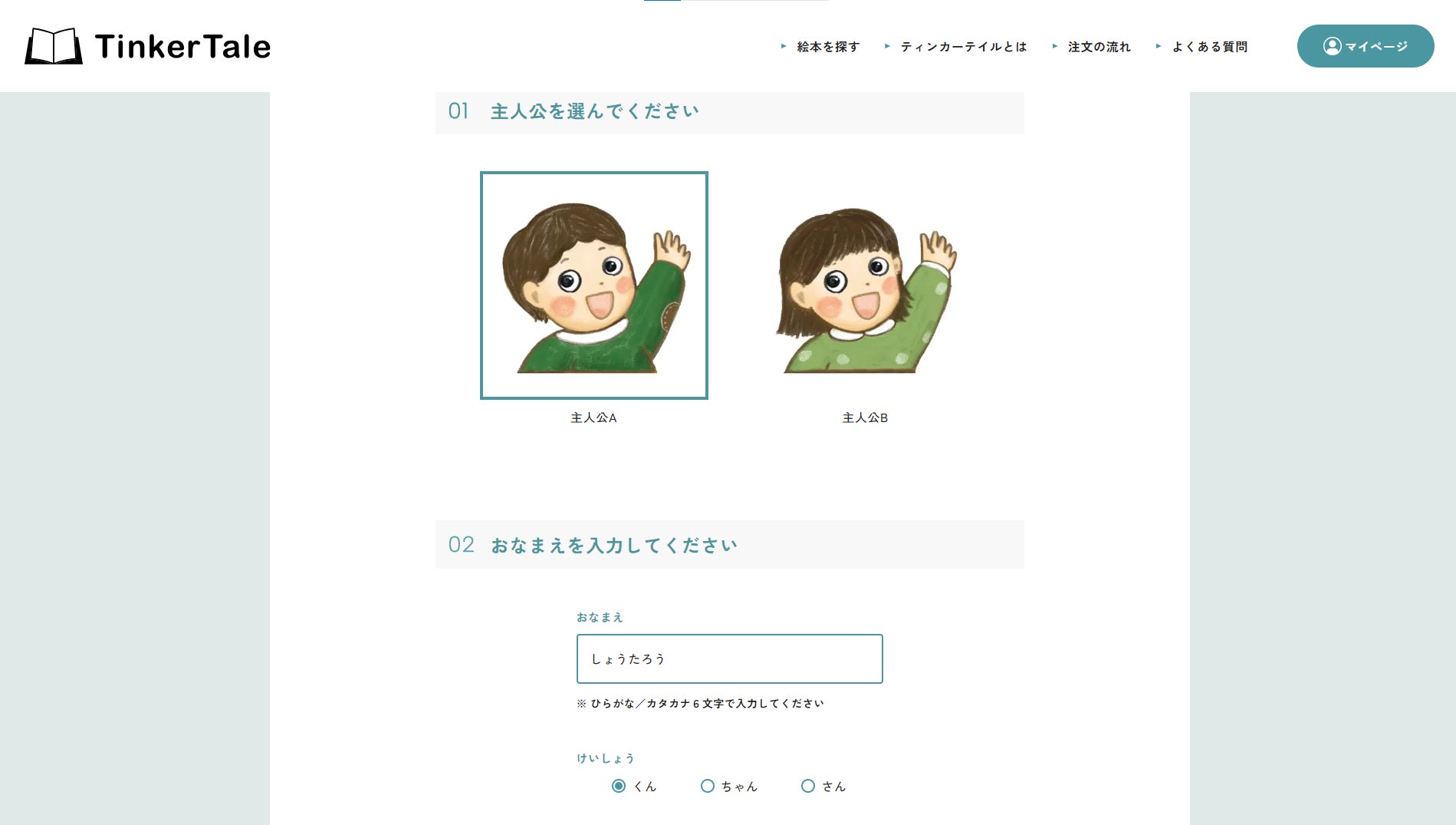 人気絵本のコンテンツを読者がカスタマイズし、絵本の主人公の名前をご自身やお子様、大切な人の名前に変更したり、キャラクターを指定したりすることができます。