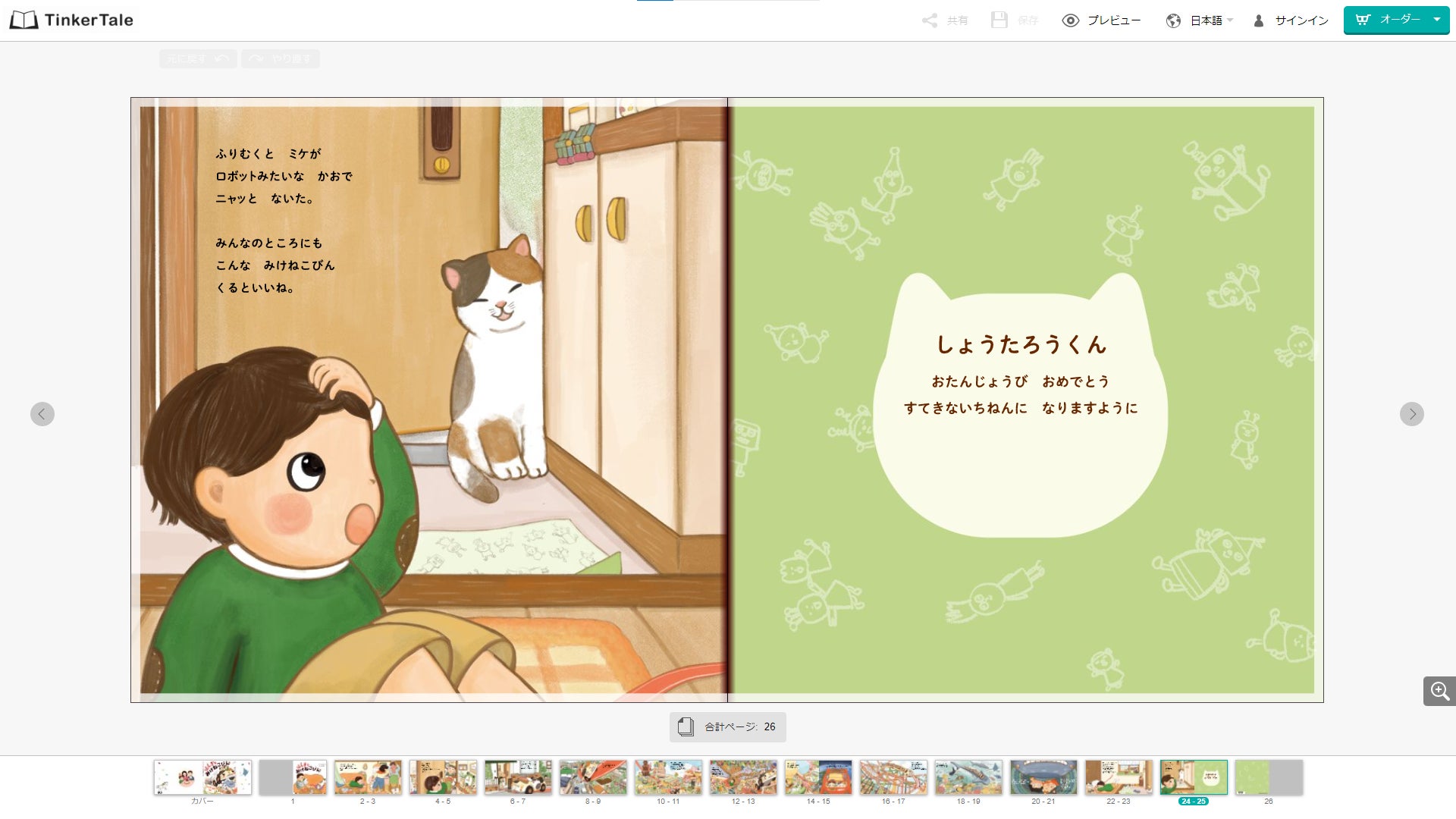 また、メッセージを添えることもでき、世界にたった一冊の絵本として、出産祝い、誕生日、入園、入学、記念日、クリスマスなどのプレゼントに最適です。