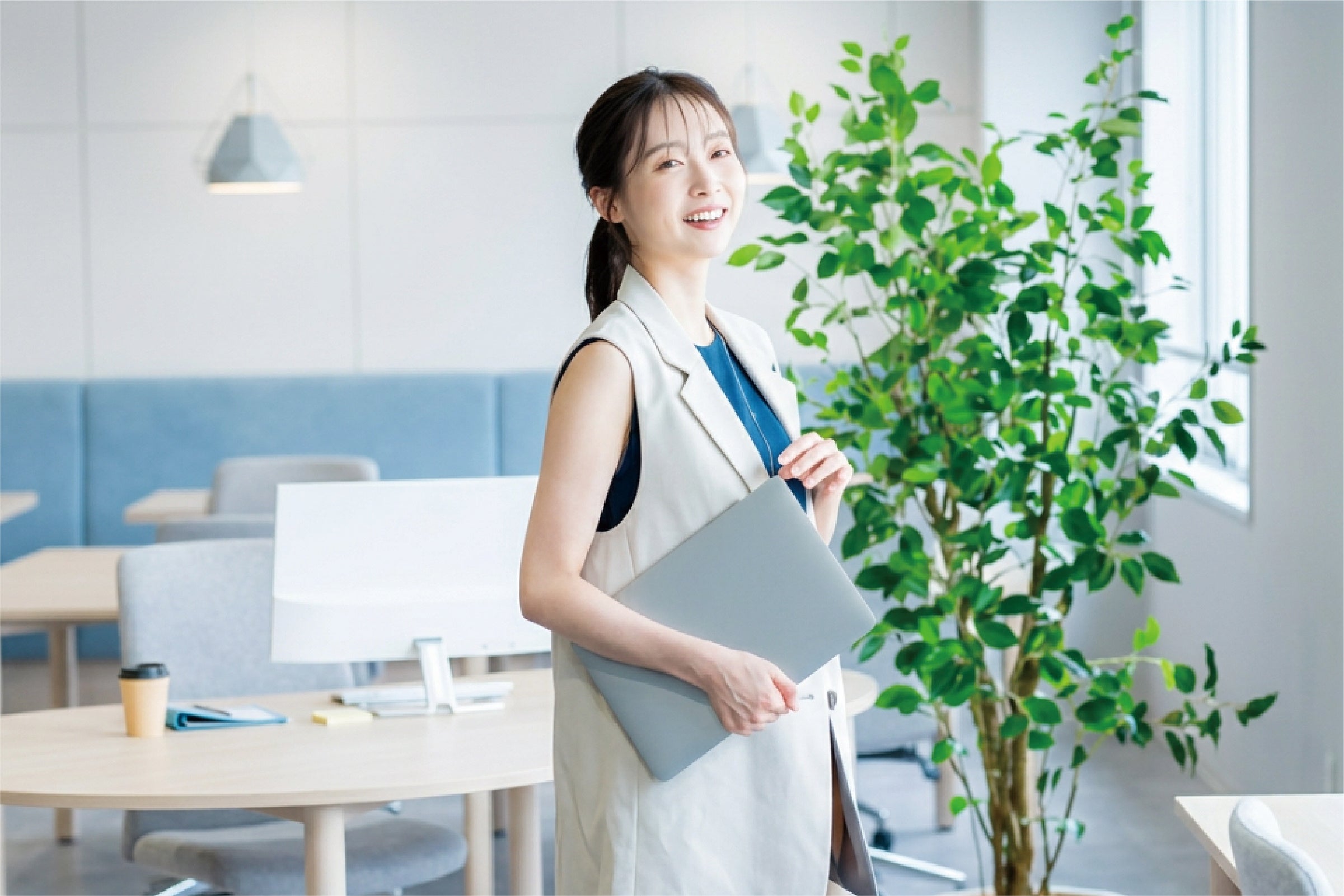 ジャケットを羽織って打ち合わせへ。ユレ防止パネルと3Dカップの効果で、バストのユレやストラップのズレを気にすることなく、仕事に集中できます。