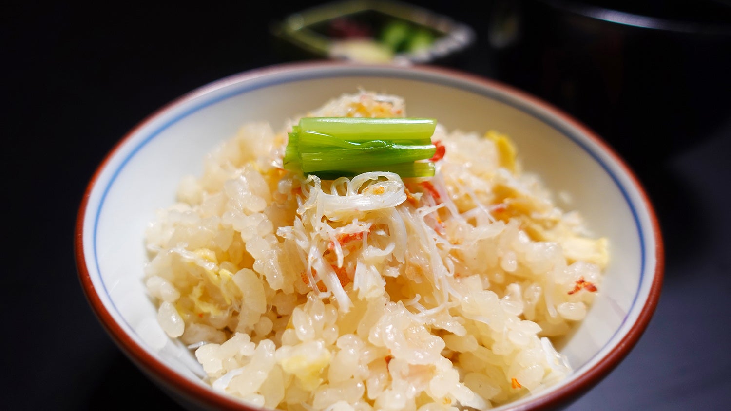 〆の御食事にも風味豊かな蟹御飯をご用意。蟹の旨味と香りをふっくらと炊き込みました。