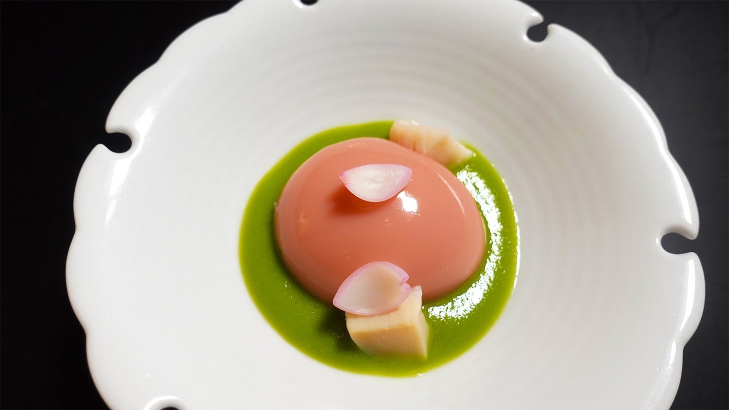 ほんのり桜風味の桜豆腐にうすい豆のすり流しを合わせた春の彩りを目でも楽しめる一皿。