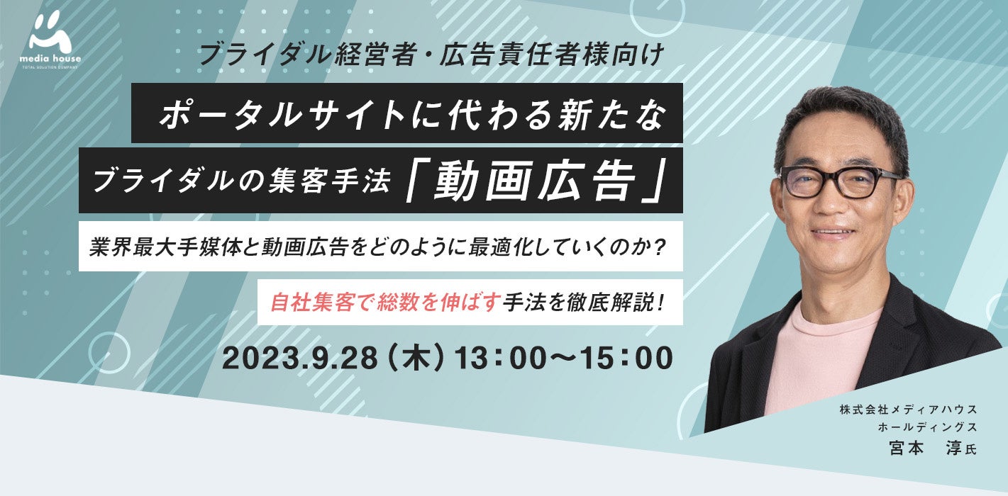 【9/28(木)ブライダル経営者・広告責任者向け無料セミナー開催】Google元執行役員で現メディアハウスホールディングスの取締役 常務執行役員の宮本が解説する「新たなブライダルの集客手法・動画広告」