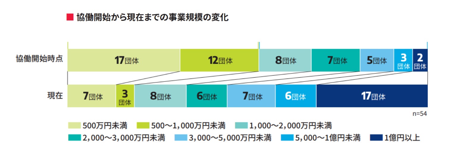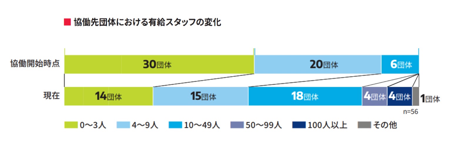 協働を開始した時点では、有給スタッフ数が3人以下の団体が30団体と最も多かったものの現在では半減、10〜49人の団体が3倍に増え、50人以上も新たに8団体生まれています。雇用創出という意味で社会にポジティブな影響をもたらしたことが伺えます。