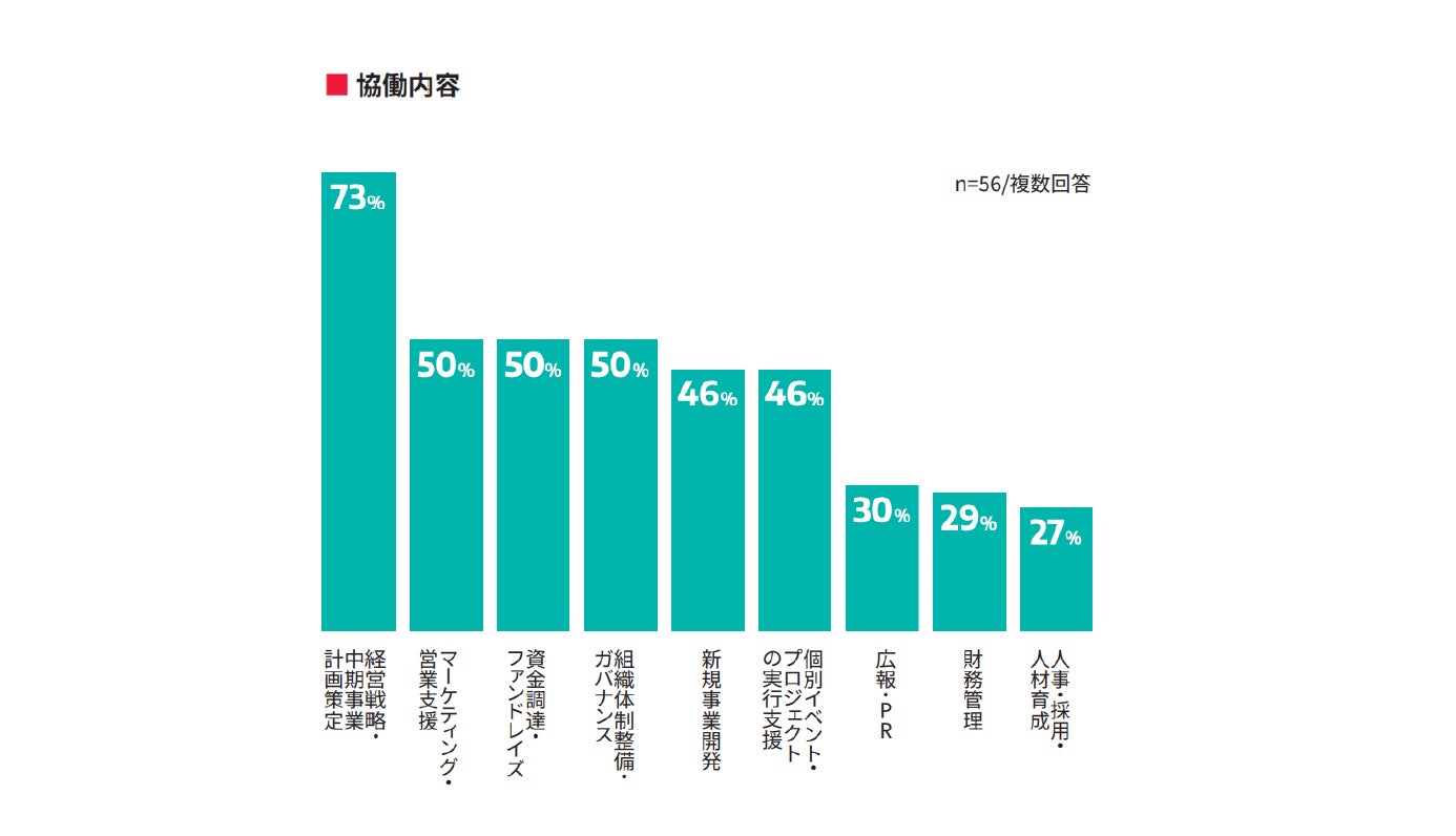 SVP東京との協働活動における具体的な支援内容で多いものは、「経営戦略・中期事業計画策定(73%)」、次いで「マーケティング・営業支援(50%)」「資金調達・ファンドレイズ(50%)」「組織体制整備・ガバナンス(50%)」が並ぶ結果となりました。