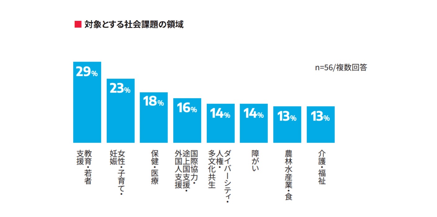 投資・協働先の対象となる社会課題の領域は、最も多いのが「教育・若者支援(29%)」、ついで「女性・子育て・妊娠(23%)、「保健・医療(18%)」という結果となりました。