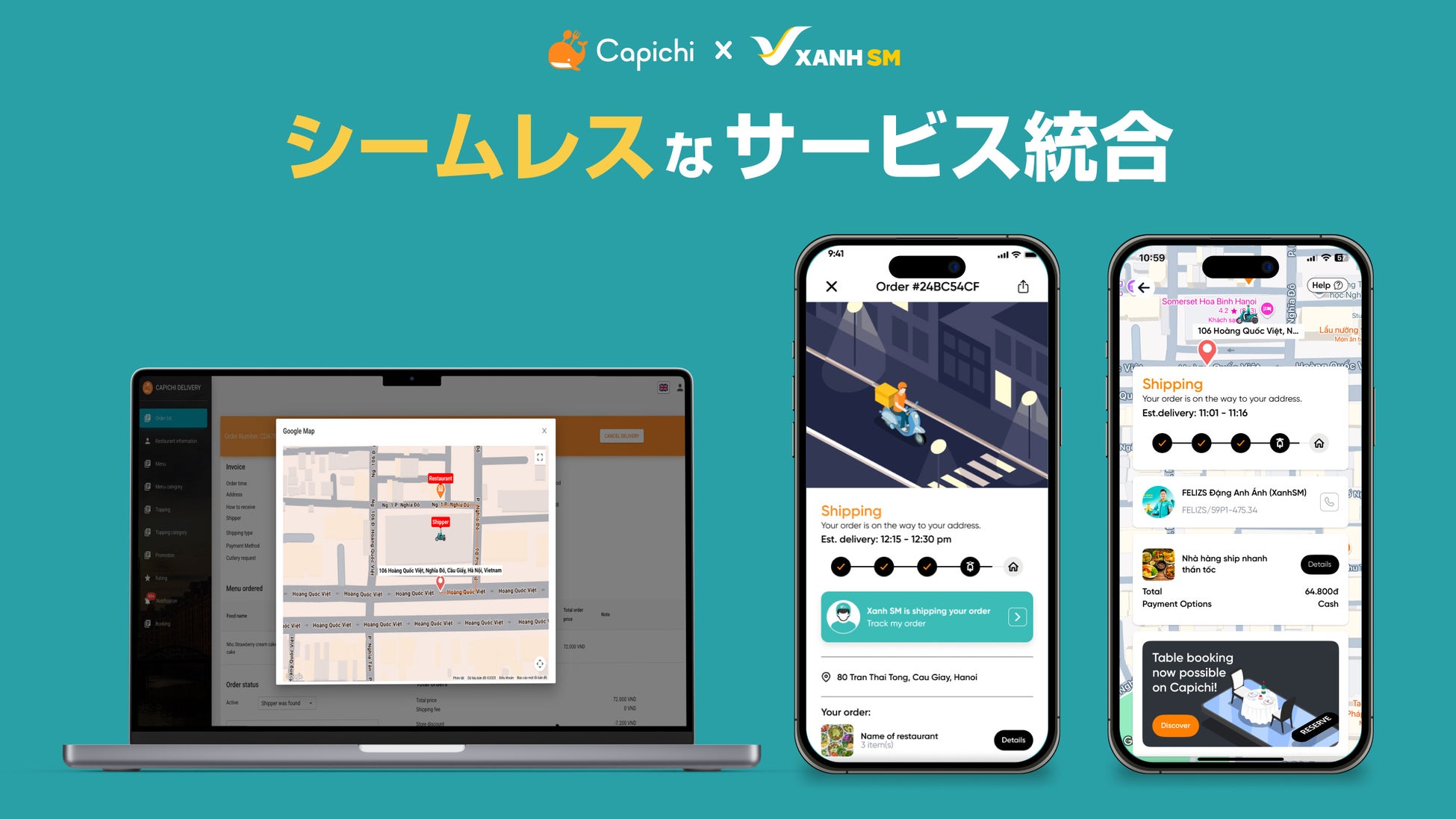 Xanh SMのGPSデータをCapichiアプリに連携することで、ユーザーは配達状況をリアルタイムで確認可能。安心感と利便性を高めます。