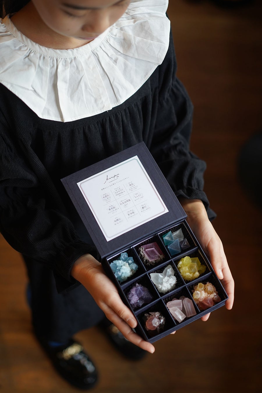 宝石や鉱物のような琥珀糖「こうぶつヲカシ」を代表作とする、福岡発女性たちのフードクリエイター集団【メルティングポットハラペコラボ株式会社】(所在地:福岡県福岡市、以下 ハラペコラボ)から、夏休みにおすすめの体験型商品が期間限定で登場。切って乾燥させるだけで琥珀糖を自宅で気軽に製作出来る「こうぶつヲカシの素」の販売7月12日より公式オンラインストアで発売し、ハラペコラボ ミュージアムショップ&カフェ(福岡本店)は7月16日、ハラペコラボ大阪店は7月17日より販売開始いたします。