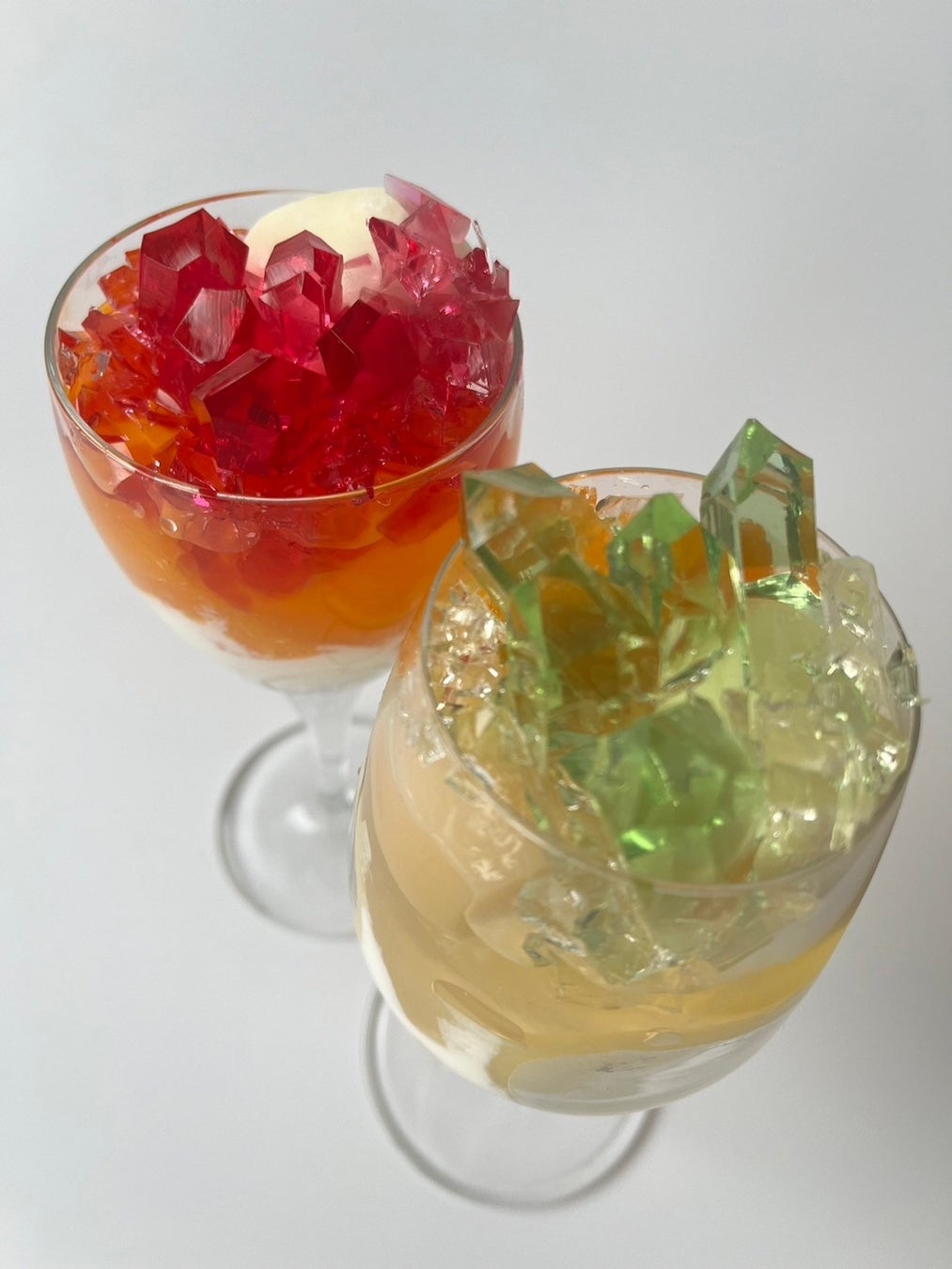切り立ての透明キラキラなまま、カットしたこうぶつヲカシをグラノーラやヨーグルト、ゼリーやアイスなどの上に載せるだけで、宝石のようなパフェを作ることができます。