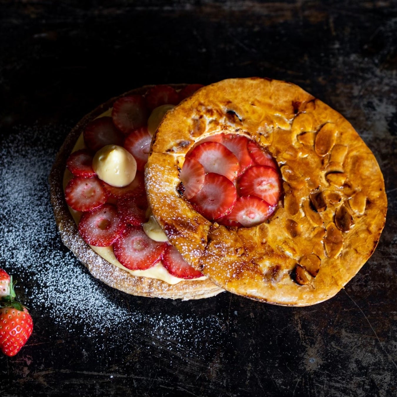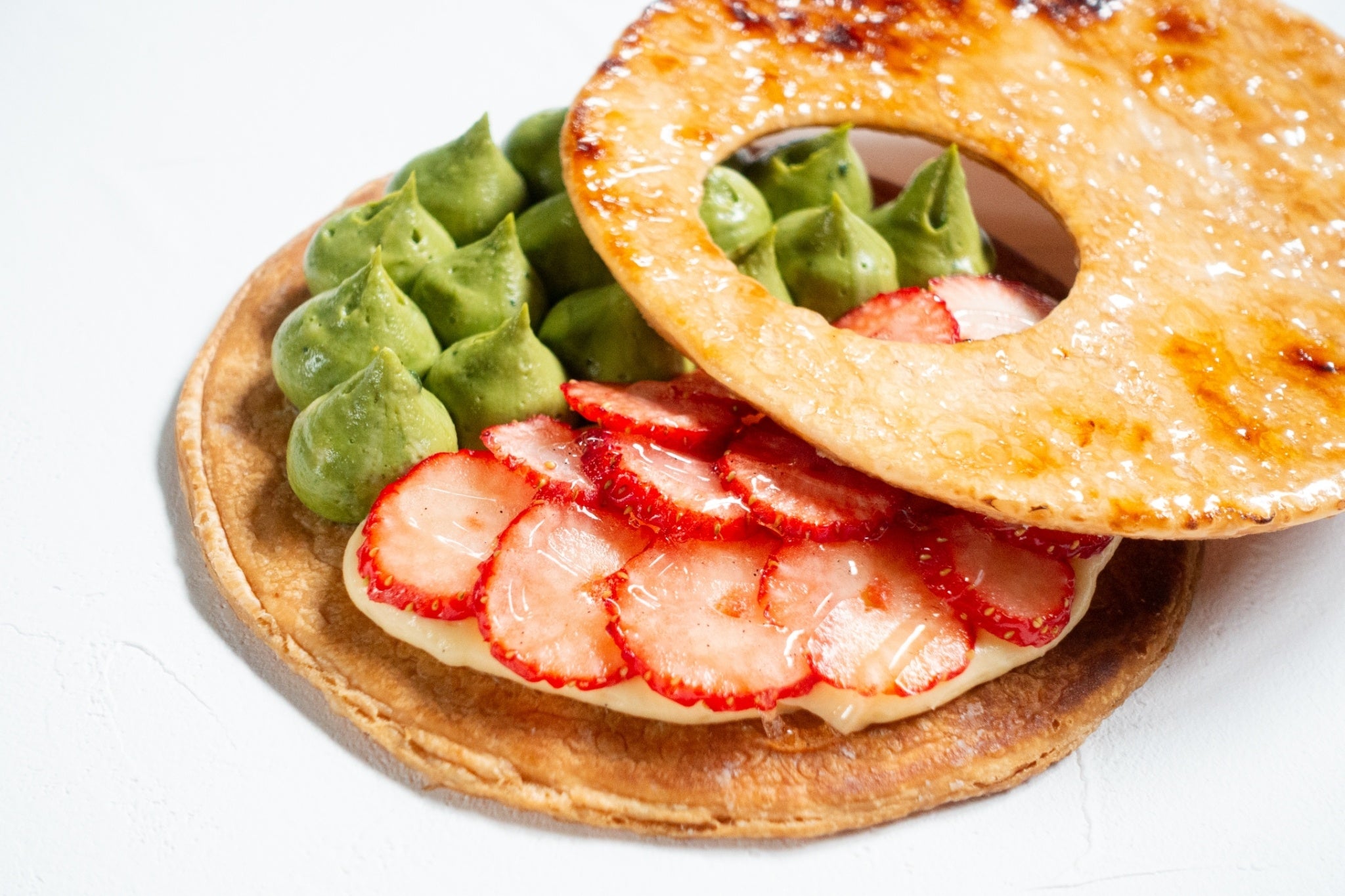 香ばしく焼き上げたアーモンドのパイ生地に、自家製カスタードを使用した苺のミルプレッセ。