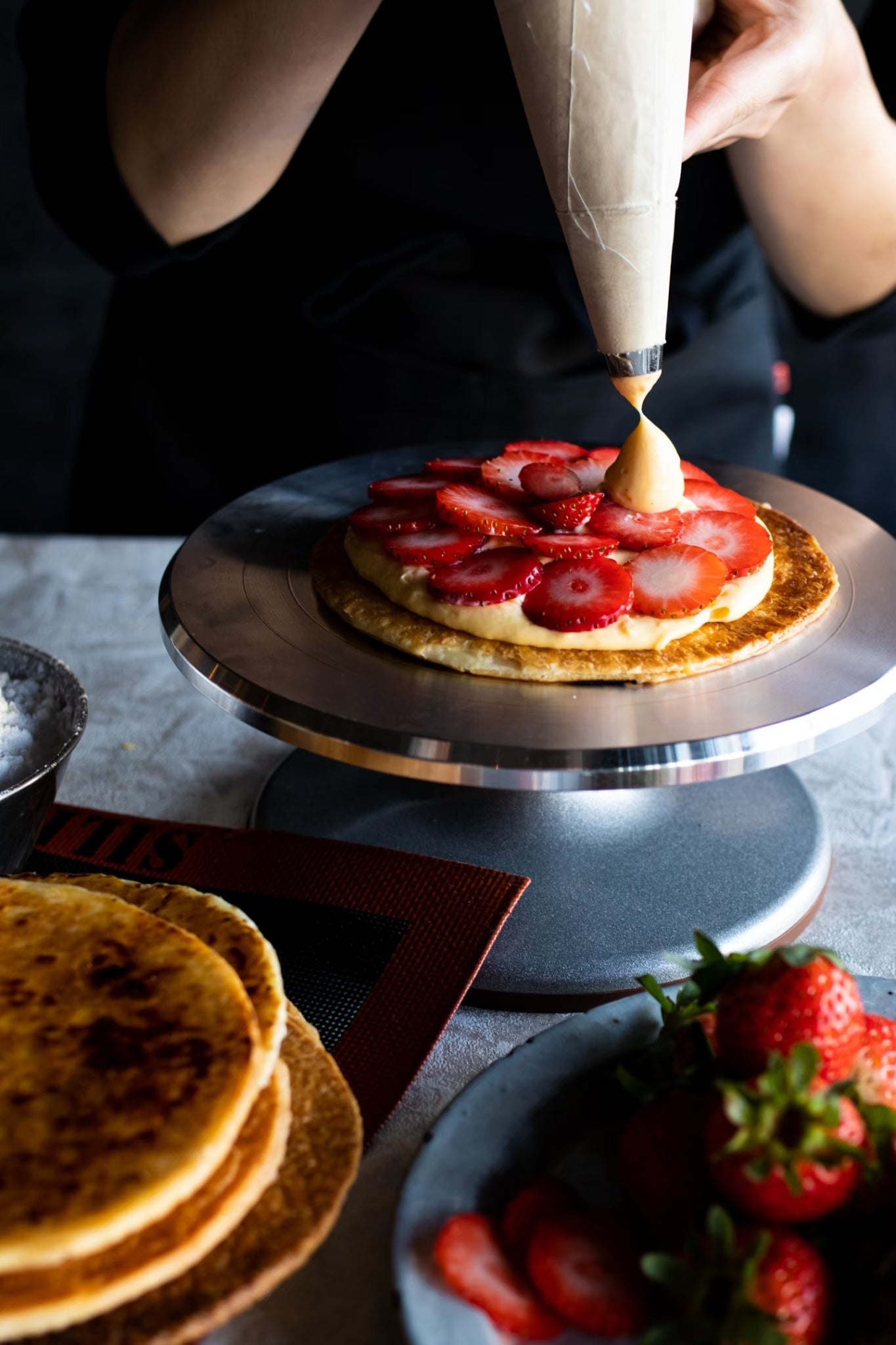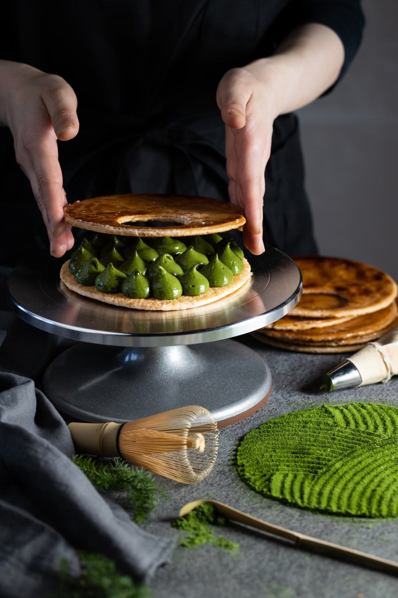 ミルフィーユからインスピレーションを得てつくられたパイ生地は、オリジナルのプレス機を用い高温短時間で焼き上げることで、香ばしい薫りと軽やかな食感を生み出します。