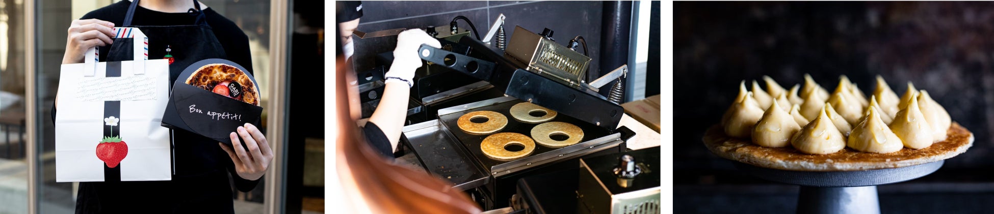 パイのサクサクとした触感やフレッシュな自家製カスタード、瑞々しいフルーツとの組み合わせを手軽に楽しんでいただきたいという想いから、独特の丸い形とライブ感ある工程に至りました。