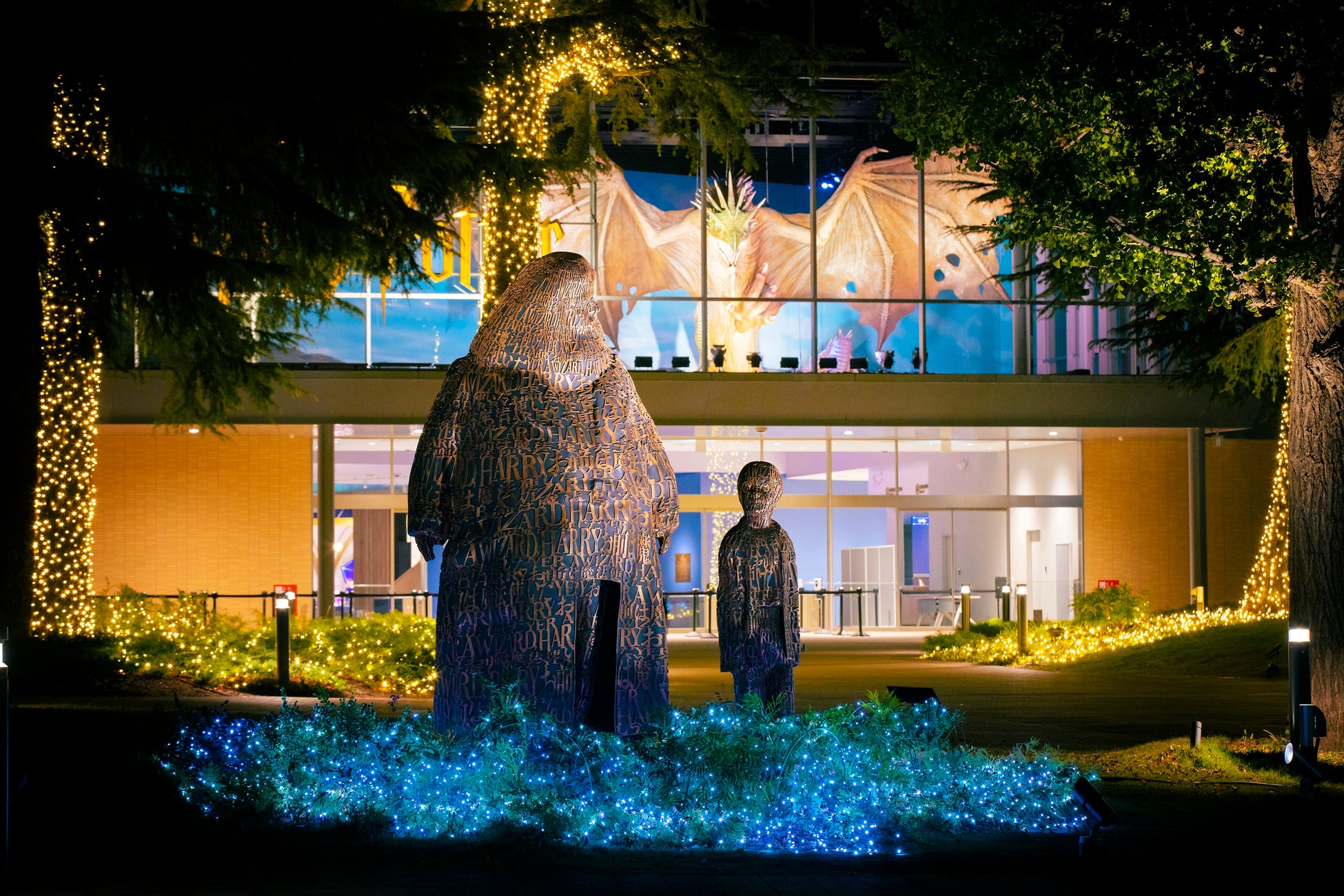スタジオツアー入り口のヒマラヤ杉のエリアほか、敷地内の公園にある映画からインスパイアされた、パトローナス像や、ハリーの眼鏡の巨大モチーフ、ナギニの像などにもクリスマスのライトアップが施され、緑に彩られた昼間とはまた違った雰囲気が楽しめます。