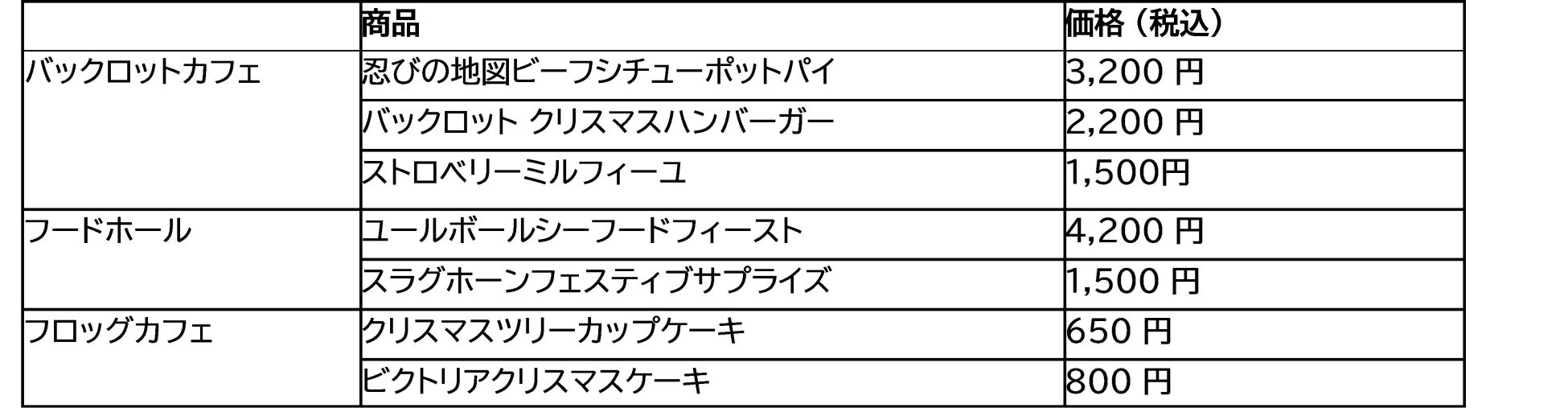 スタジオツアー東京では、館内に3か所ある飲食店舗それぞれにて、クリスマス・シーズン限定のフードメニューを展開いたします。映画「ハリー・ポッターと炎のゴブレット」で登場するクリスマスダンスパーティー、「ユールボール」のシーンをイメージしたメニューなど、作品の世界観を取り入れたこの時期にしか食べられない、限定のメニューをお楽しみください。