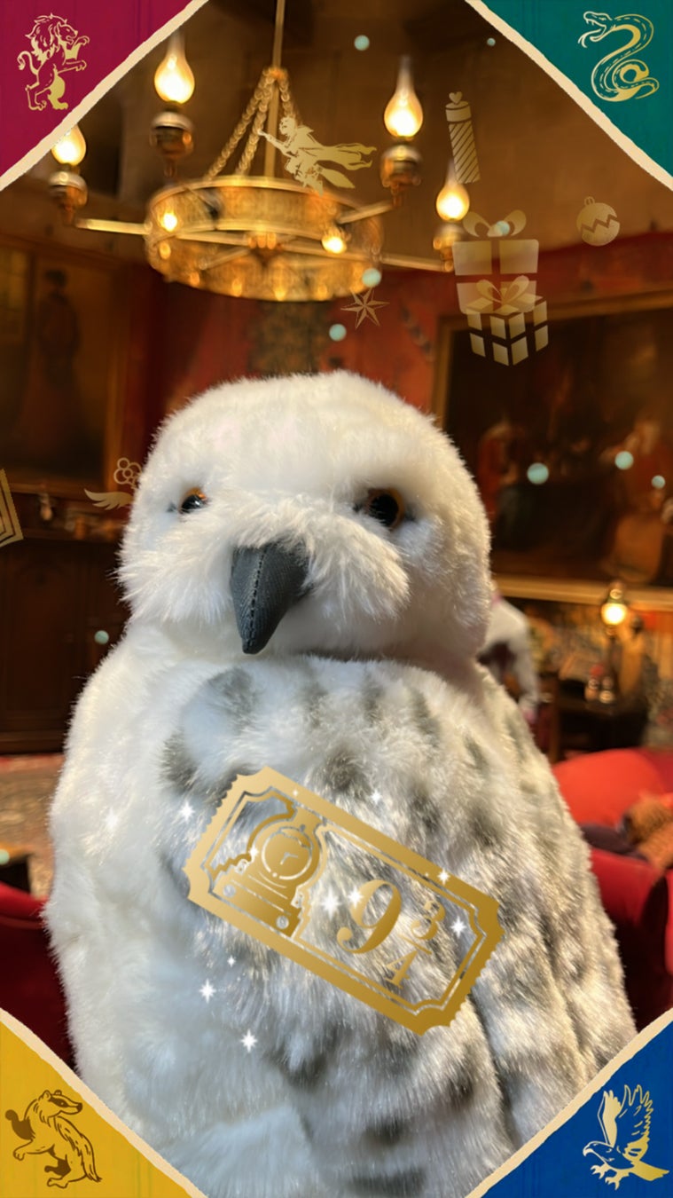 このARフィルターでは、ホグワーツの4つの寮のモチーフのデザインが施されているだけではなく、ハリー・ポッターにまつわるモチーフが、写真に映った人物のまわりをくるくると飛び回ります。また、雪が舞うエフェクトは、スタジオツアー東京のツリーの前はもちろん、大広間やグリフィンドールの談話室など、クリスマスのシーンでおなじみのセットでの記念撮影にもぴったりです。