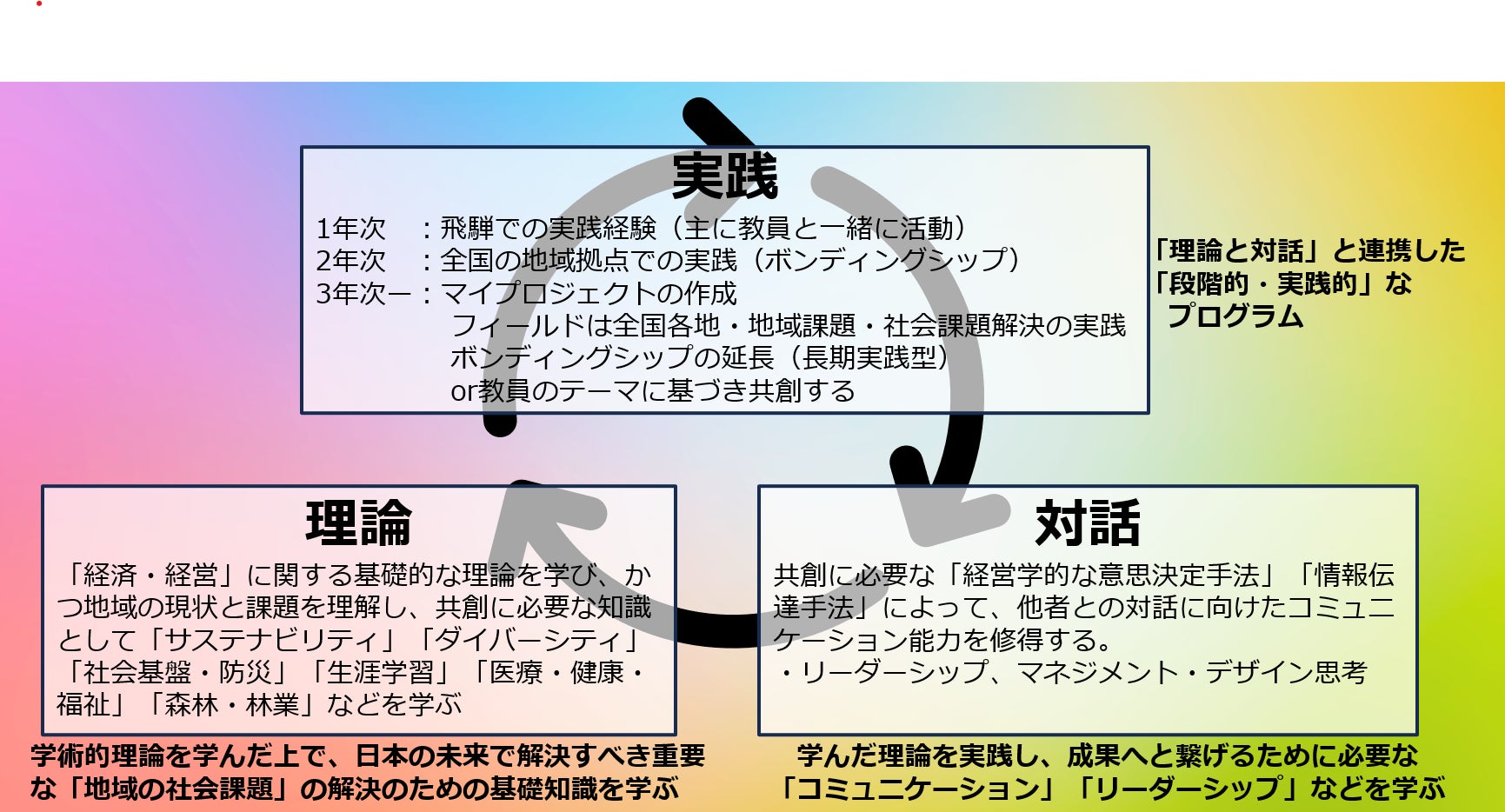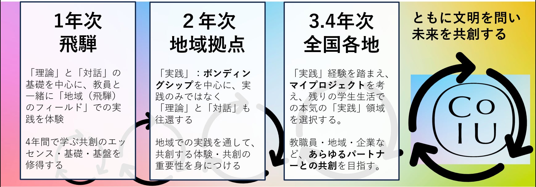 現時点の構想では、1年次は飛騨で理論と対話を中心に学び、2年次は全国の連携拠点でボンディングシップを週に3日程度「実践」するとともに、オンライン講義と併用し学びます。