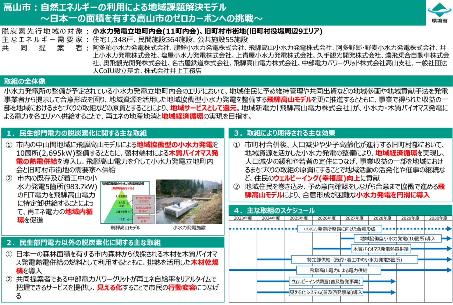 コンソーシアムとしては、環境省が募集した「第4回脱炭素先行地域」に、高山市及び、他14社と共に共同提案者として参画いたしました。