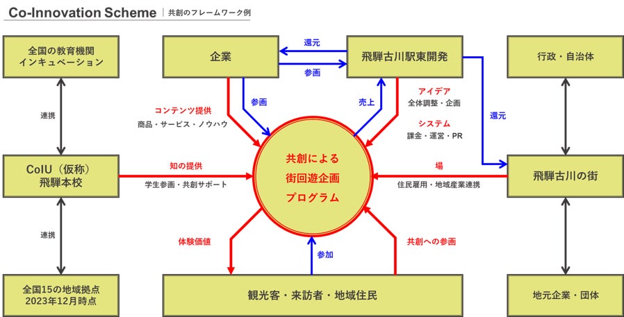 大学設立後に「学生」や「教員」が「街」と共創し、駅東開業後に「企業」や「アーティスト」が「街」と共創していくことで、飛騨古川の回遊性を高め、地域や地場産業を活性化していくためのキックオフとなる実証実験です。