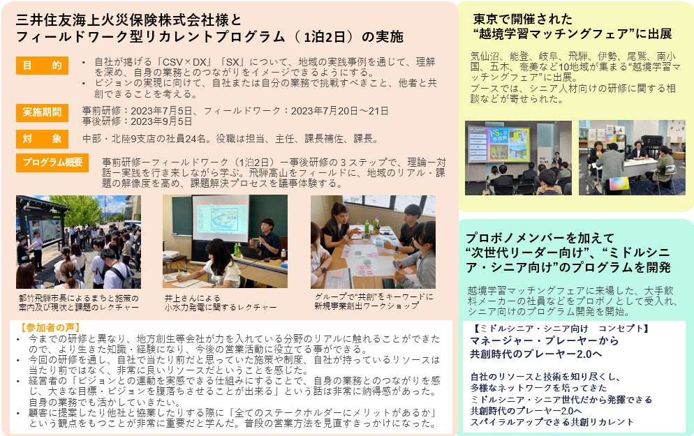 その実証的な取り組みとして、2023年7月〜9月にかけて、三井住友海上火災保険株式会社との共創によるフィールドワーク型リカレント研修を中部・北陸支社の社員24名を対象に実施。