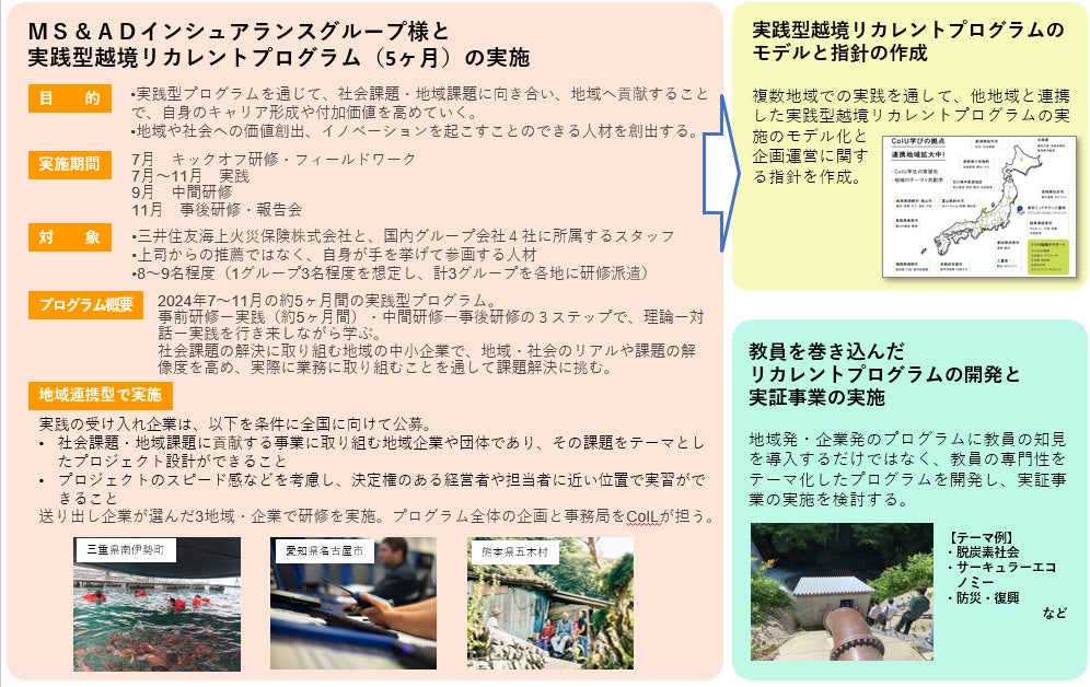 2024年度は、MS&ADインシュアランスグループ様と、全国3地域をフィールドに、実践型越境リカレントプログラム(5ヶ月)の実証を行うとともに、教員候補者を巻き込んだリカレントプログラムの開発、実証に取り組む予定です。