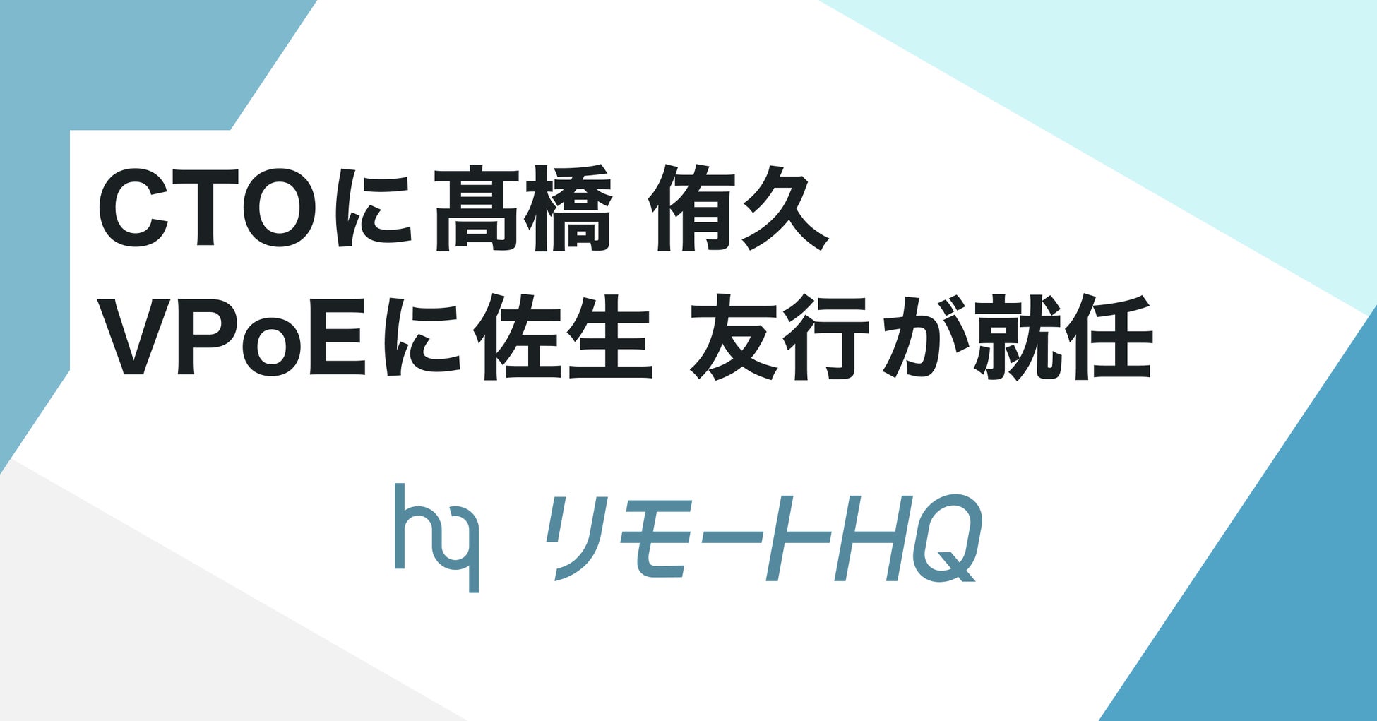 リモートワーク支援プラットフォーム「リモートHQ」を提供する株式会社HQ(本社:東京都新宿区、代表取締役:坂本祥二)は、2022年12月1日付でCTOに髙橋侑久、VPoEに佐生友行が就任することをお知らせいたします。