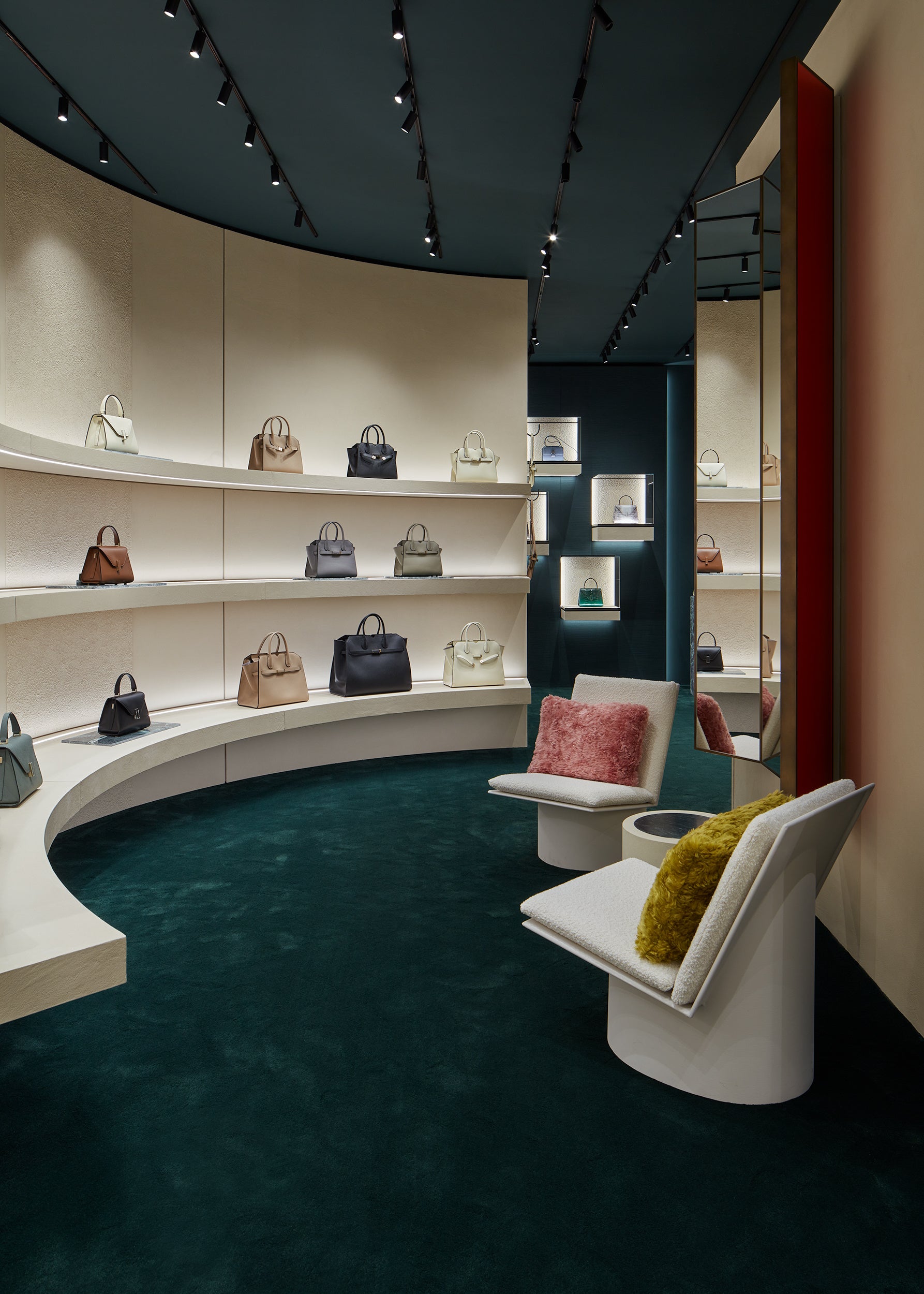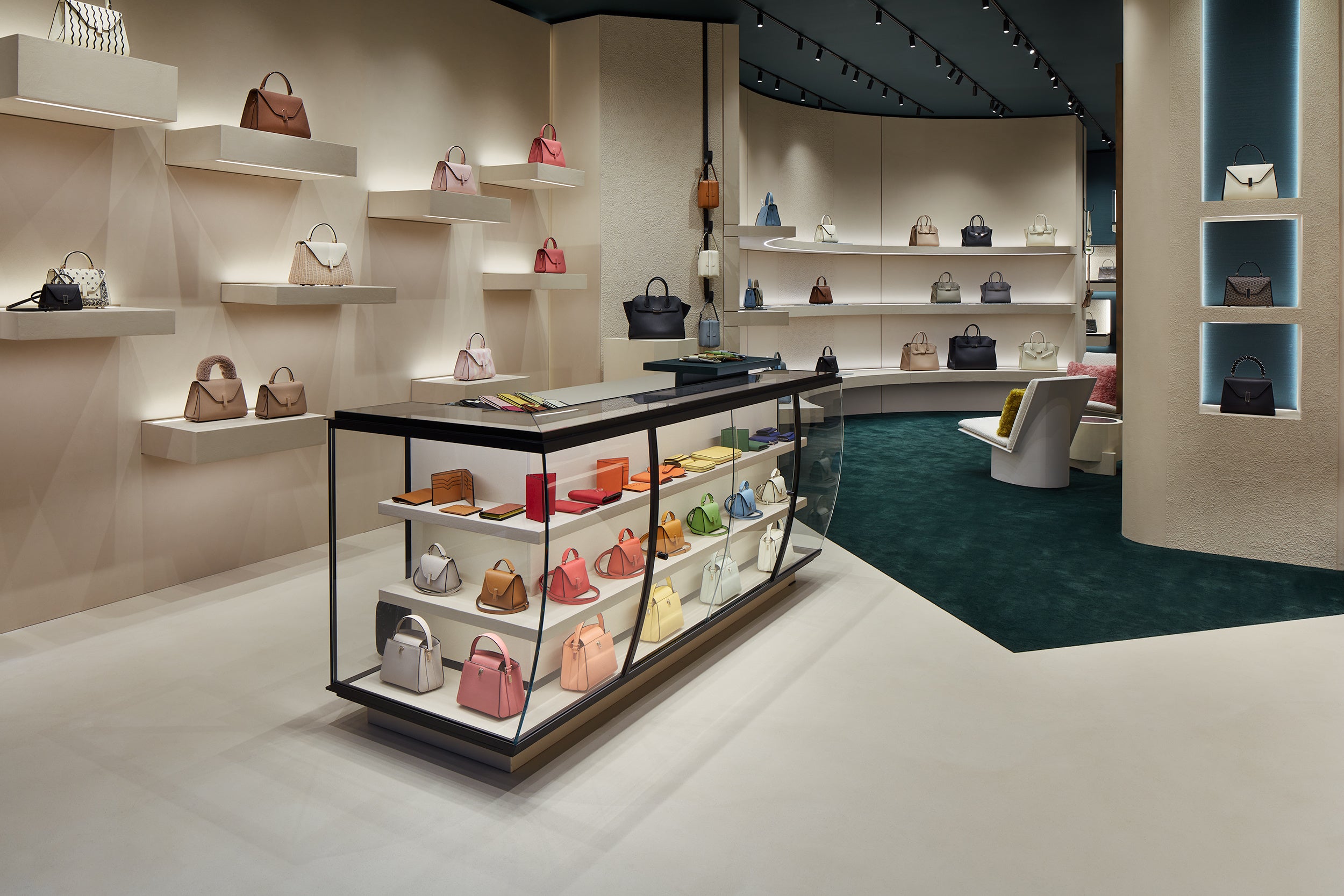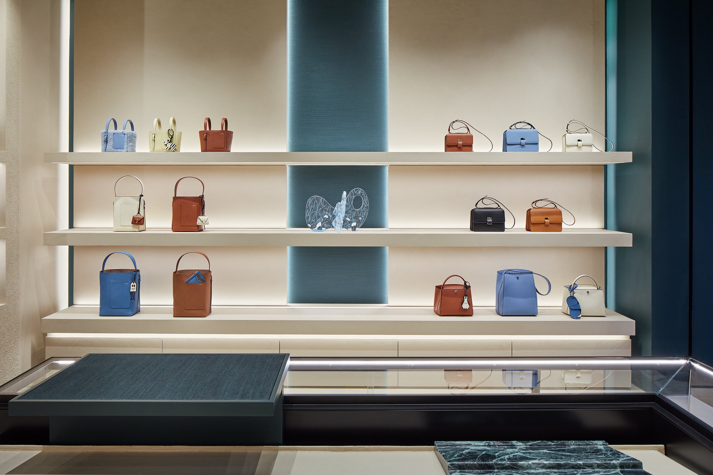 ブティックそのものが、このコンセプトを象徴しています。イタリアングリーンの大理石で覆われ、伝統的なウッドパネルが施された窓のある空間は、フランスとイタリア双方の建築様式とデザインを特徴としています。店内はエレガントなミラノのアパルトマンのような魅力的な空間に、ヴァレクストラの機能的で美しいレザーグッズが置かれ、双方のほどよい緊張感が強調されています。