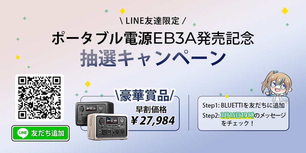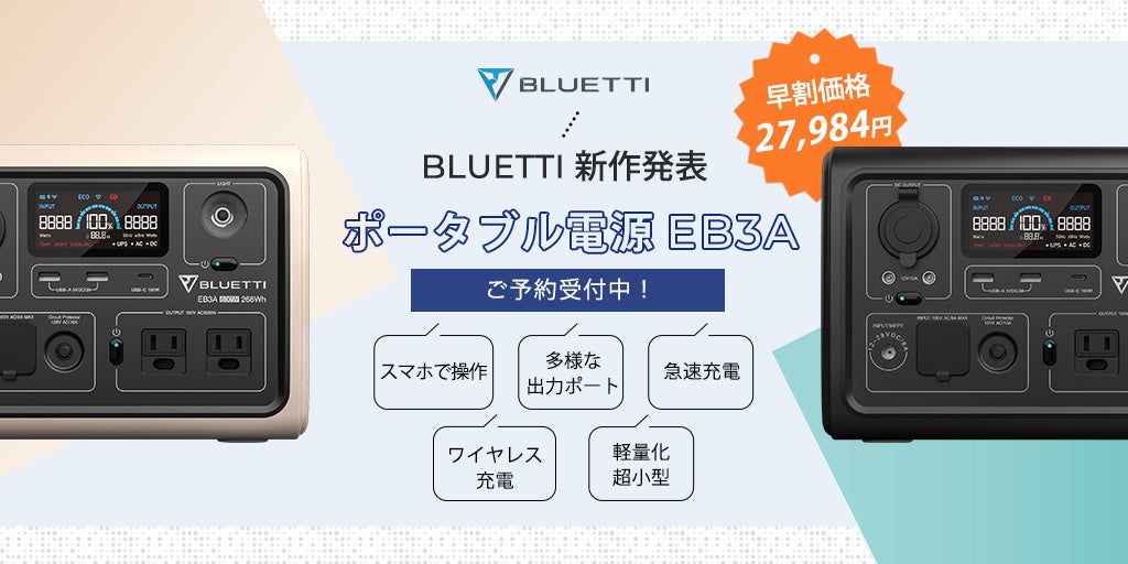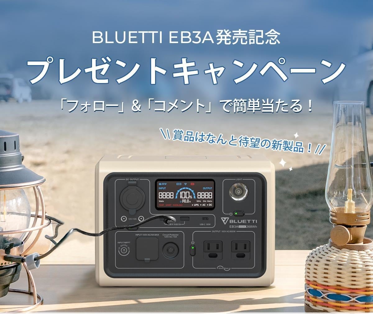 「新製品BLUETTI EB3A発売記念キャンペーン」開催中、抽選で合計3名様へ軽量・大出力ポータブル電源『EB3A』をプレゼント