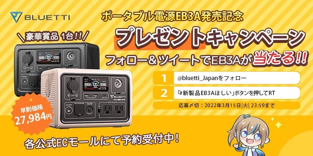 ポータブル電源の製品開発に注力している企業BLUETTI(ブルーティ) JAPAN株式会社は、3月1日より軽量で大出力のポータブル電源『EB3A』を予約販売開始。ツイッター、インスタグラム、LINEなど各種公式アカウントのプレゼントキャンペーンを2022/3/1(火)から2022/3/15(火)23:59までの期間限定で実施します。