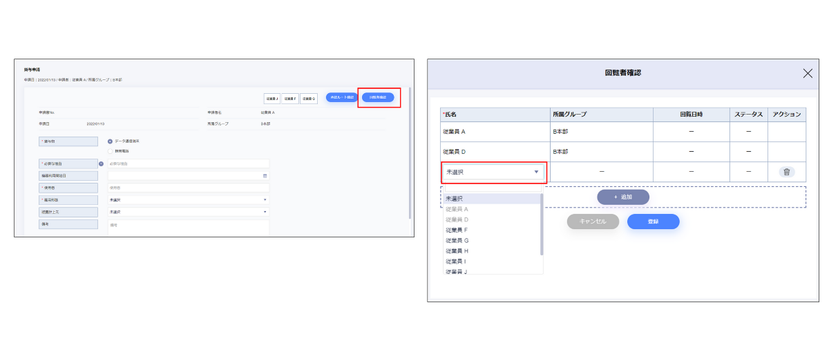 回覧者を追加する際は、申請書の回覧者確認画面を表示し[追加]をクリックすることで登録することができます。