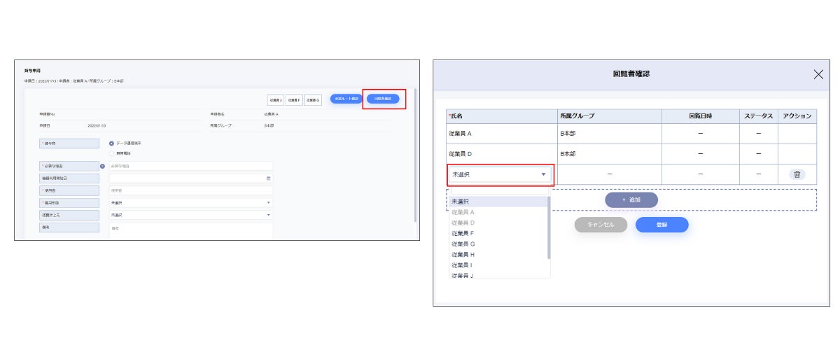 回覧機能とは、申請書の内容や進捗を、承認者以外の従業員でも回覧できるように設定する機能です。今回の機能アップデートにより、回覧者が回覧の記録を残すことができるようになり、より内部統制の取れた運用を実現することが可能です。