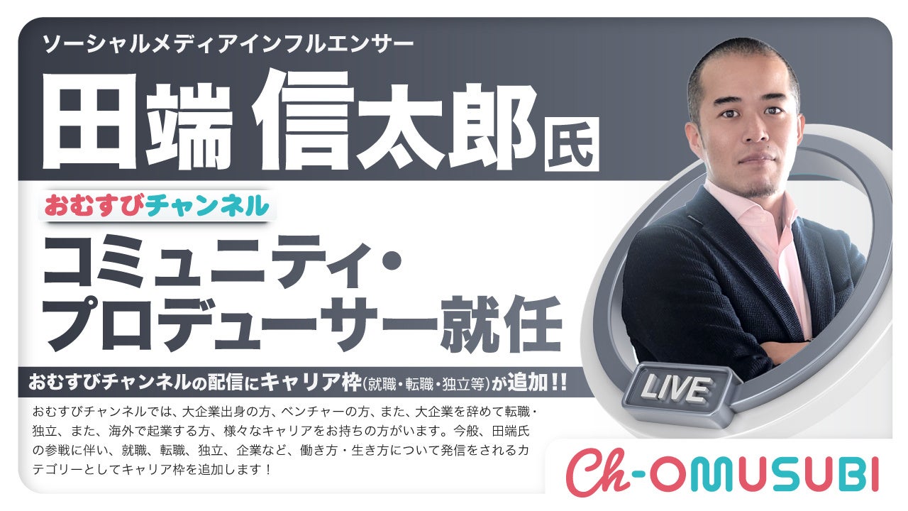 田端信太郎氏は、日系大手企業・新興企業、外資企業での勤務/転職経験に加え、独立経験もあり、また、個人としての相当な発信力を有しており、「コミュニティ・プロデューサー」として、おむすびチャンネルを、より魅力的なプラットフォームに昇華していくために、相応しい方である、と信じています。