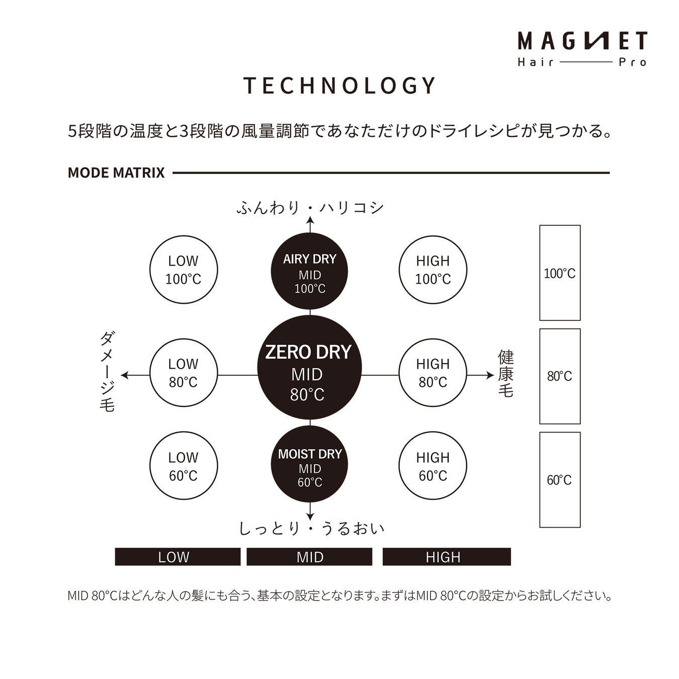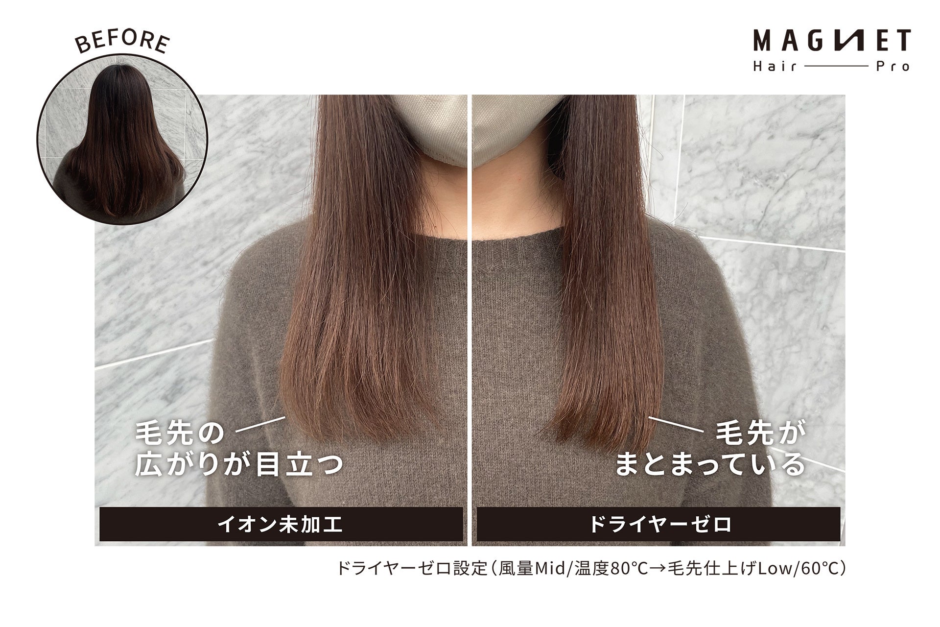 昨年11月に発売した速乾・軽量・美髪効果すべてが高スペックの「マグネットヘアプロ ドライヤーゼロ」はヘアスタイリストたちの間で話題となり「とにかく軽い」「心地よい風ですぐ乾く」「乾かすだけでキマる」など、SNSを中心に沢山の口コミをいただいております。毎日様々なコンディションの髪を何十人とブロードライするヘアスタイリストのために生まれた、どんな髪質やスタイルも思い通りに仕上げることができるプロユースのデザイニングドライヤーです。