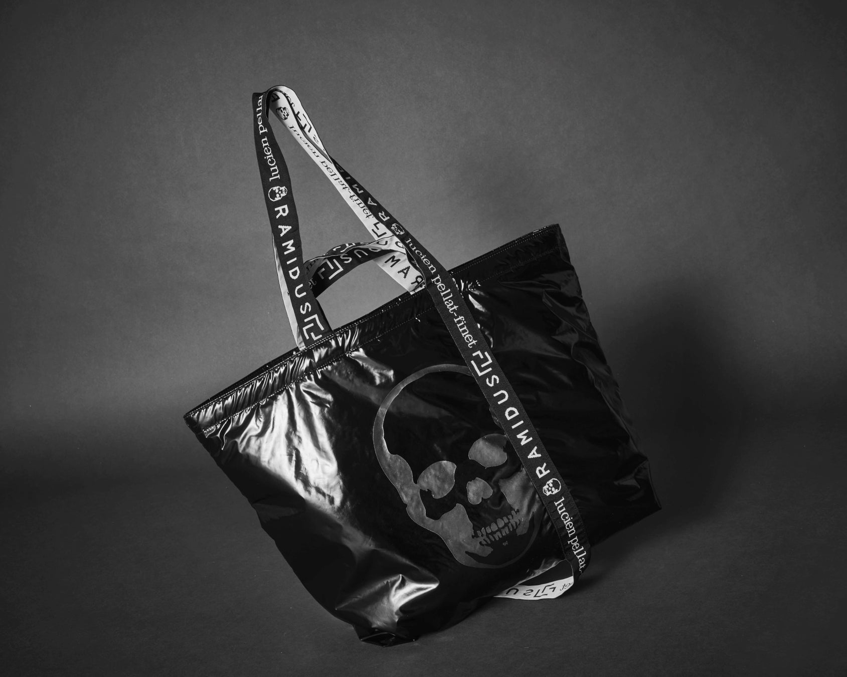 持ち手のジャカードテープには、RUMIDUSの文字とスカルを配置。