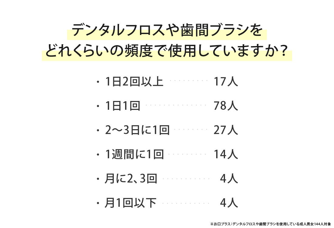 お口プラスでは、歯間ブラシやデンタルフロスを使っている人に対し、「歯間ブラシやデンタルフロスをどれくらいの頻度で使用していますか?」というアンケートを取りました。