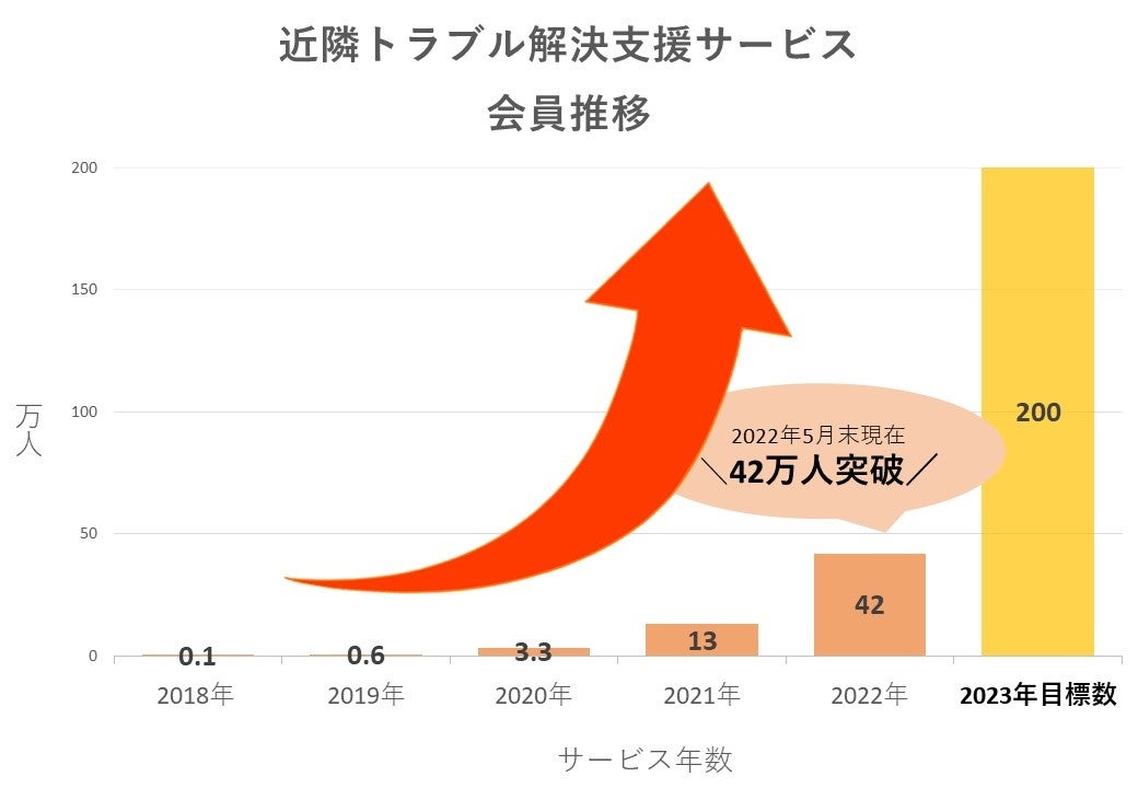 当社主要事業として展開している「近隣トラブル解決支援サービス」は、2015年のサービス開始から7年で、会員数は全国約42万人(2022年5月末時点)に上っています。