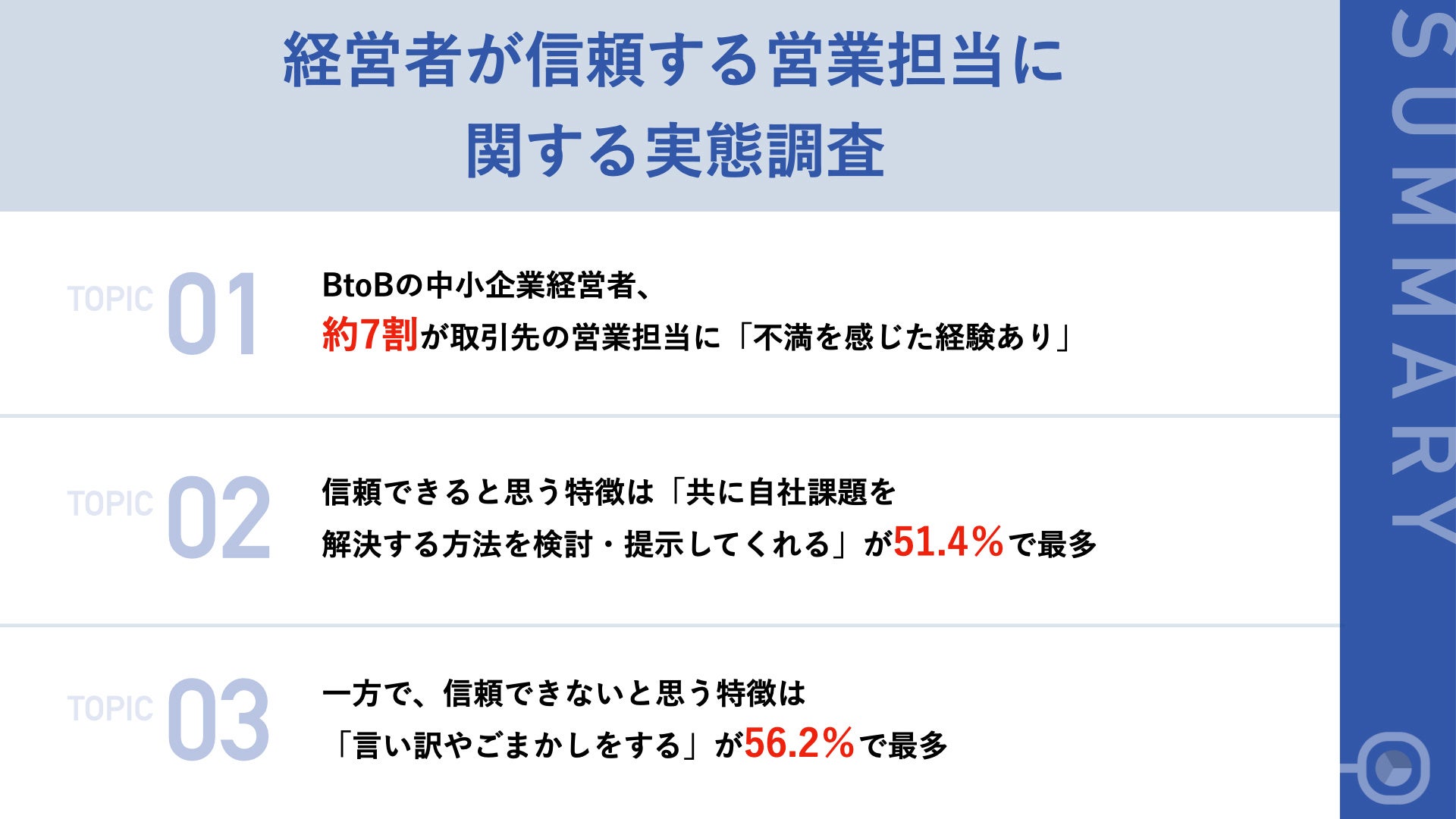 まず、約7割のBtoBの中小企業経営者が、取引先の営業担当に「レスポンスが鈍く、スピード感がない」や「事業・サービスをよく理解していない」などといった不満を感じた経験があることがわかりました。続いて、信頼できる営業担当の特徴として挙がったのは、半数以上が「共に自社課題を解決する方法を検討・提示してくれる」となり、一方で信頼できないと思う特徴としては、「言い訳やごまかしをする」や「曖昧な表現を多用する」といった声が多くありました。